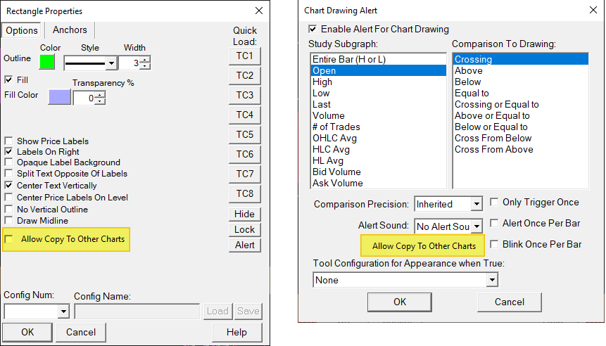 The function "Allow Copy to Other Charts" is always on and is also valid for all drawings. It would be more advantageous if you could select this function in the properties and also save it in the TCs. And it would be even better - from my point of view of course - if this function could also be selected in the "Chart Drawing Alert" (see pic). Many thanks |