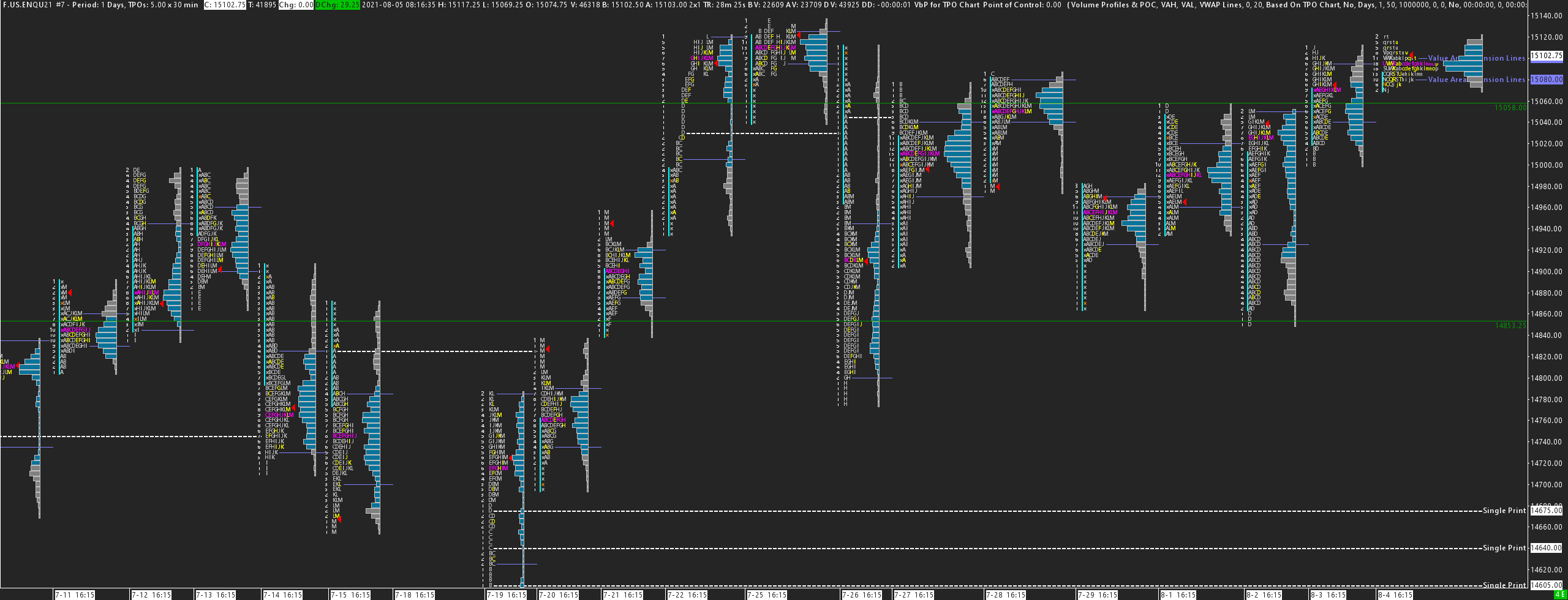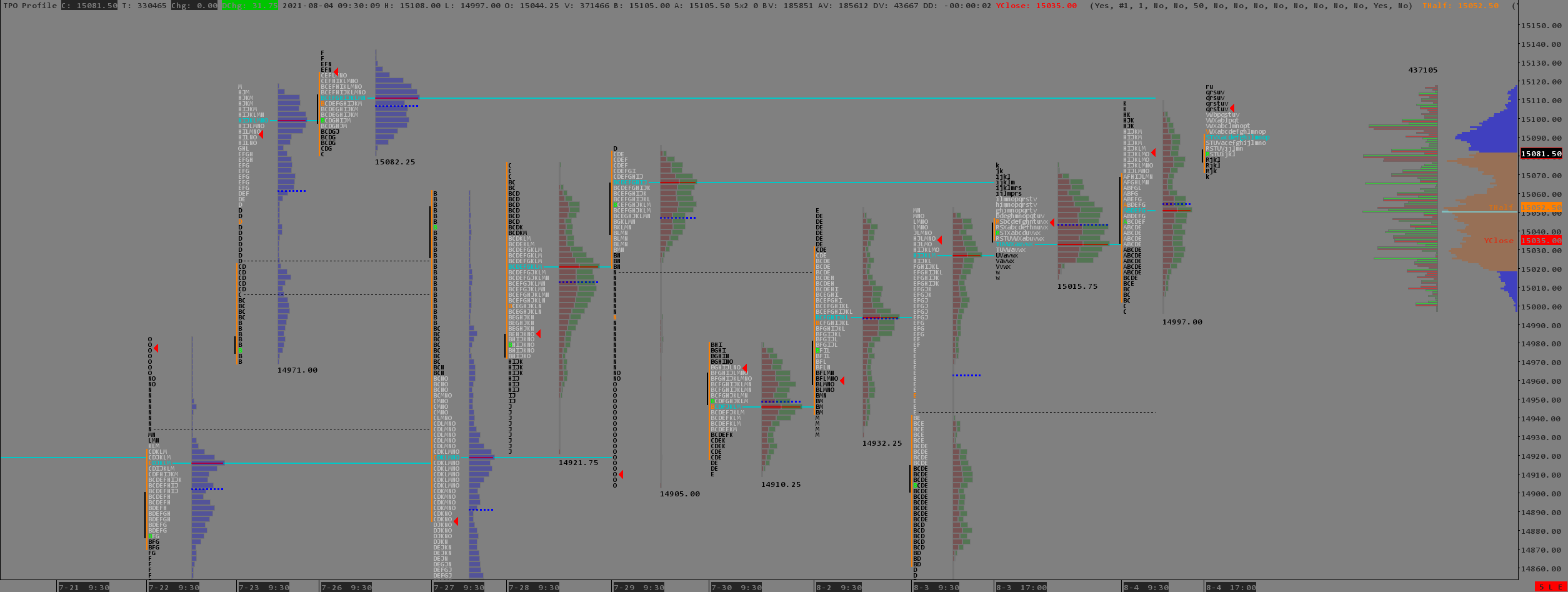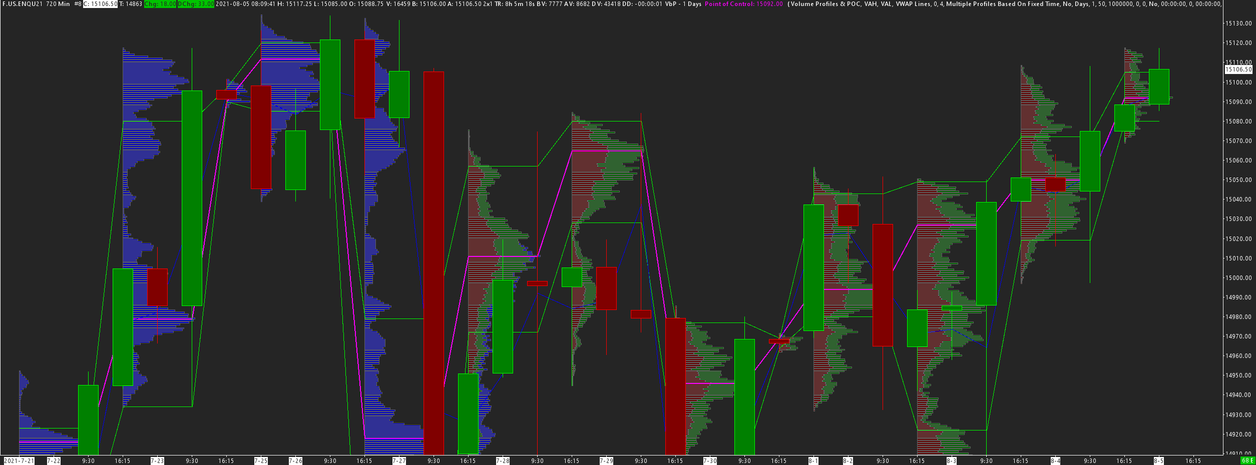 Hey John, I'm not sure if you attached a pic to your response, either way I'm not seeing what you're seeing. I did as you suggested (new chart) and I'm still getting the same issue. And I don't think it has anything to do with setting the profile to weekly or daily. Since even setting the profiles to daily will give me the same issue but only for any profiles that are more than a week old. Could it be something to do with historical data? http://www.sierrachart.com/image.php?Image=1628165384867.png Here is a 12 hour chart using the default subgraph settings for VBP Edit: Here is a TPO chart using VBP and you'll notice the same issue in the Volume profiles. It's weird. http://www.sierrachart.com/image.php?Image=1628165677199.png Here is another TPO chart without the issue... http://www.sierrachart.com/image.php?Image=162816579830.png Edit 2: It's the Volume bar coloring method. This only happens when splitting the color between bid/ask Date Time Of Last Edit: 2021-08-05 12:33:27