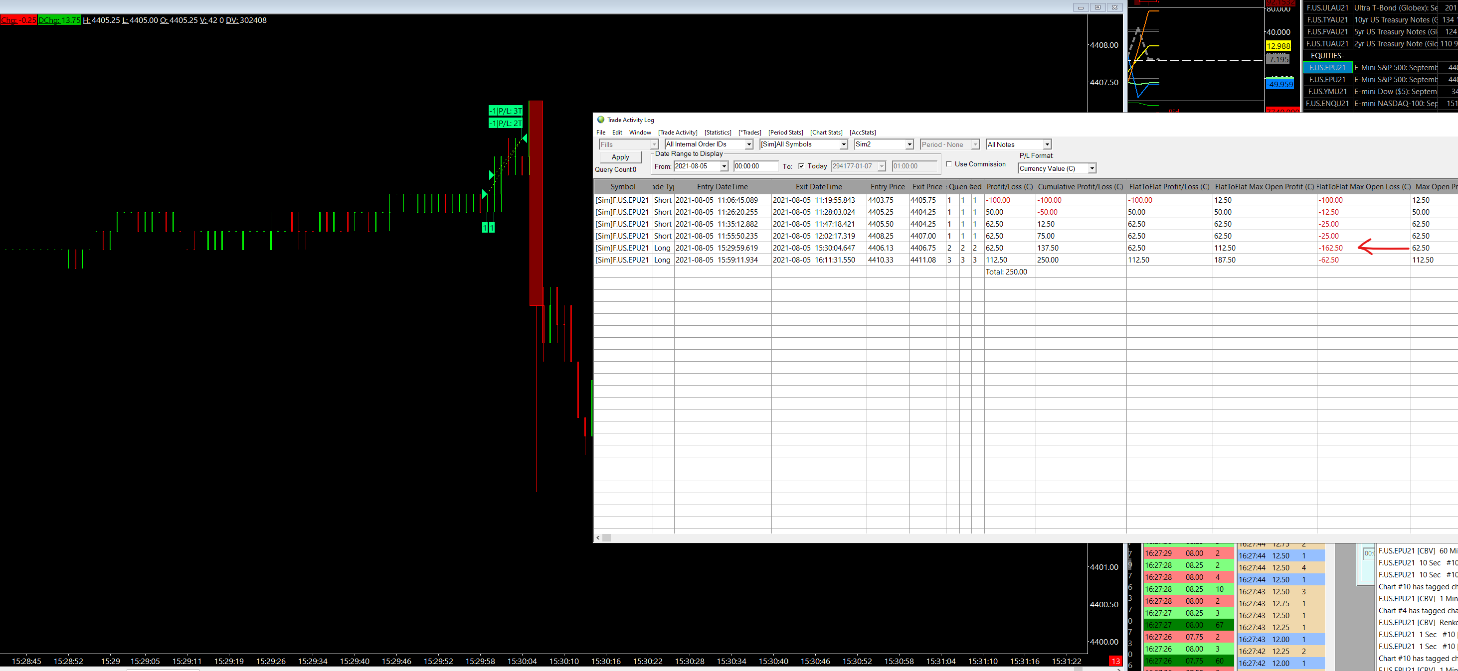 The Max open loss on the log with the arowed row shows a value of 162.5, which is 12 ticks for the ES. Take a look at the chart, do you see the trade ever being in such a loss on that chart? |
