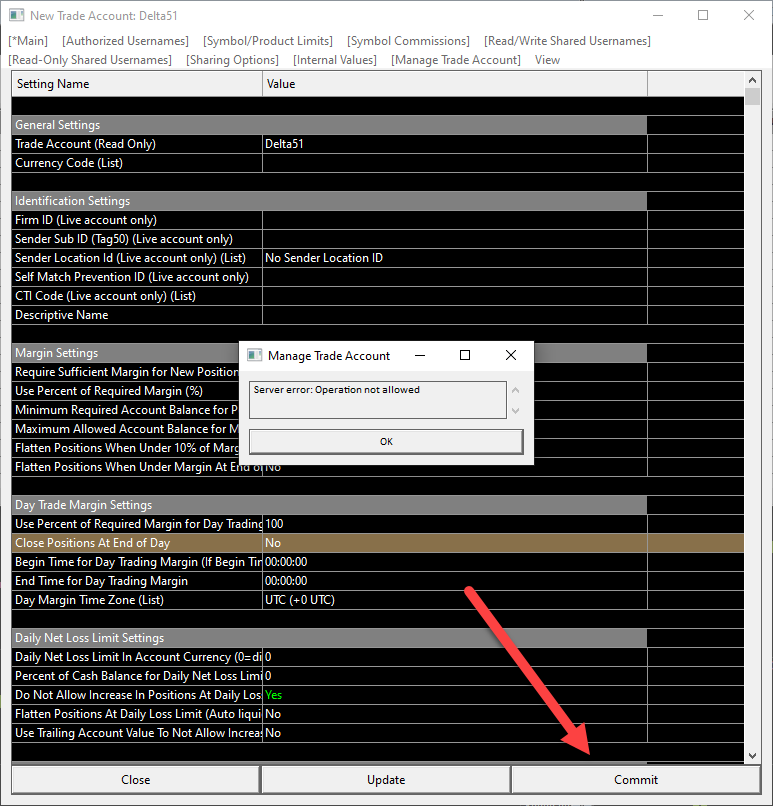 What is the name of the account that you are trying to create? Special characters could be a problem. Please limit characters to just the Alphanumeric along with Dash (-) and Underscore (_). Make sure you have entered the Currency Code. Those are the two things you need to specifically enter to create the account. Then select Commit. Let us know if you still have an issue. For the most reliable, advanced, and zero cost futures order routing, use the Teton service: Sierra Chart Teton Futures Order Routing |