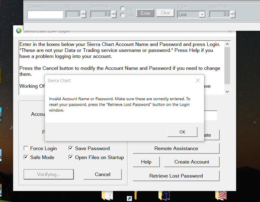 Hello, i use infinity futures broker and always if i want to login sierra show me invalid account name or password. I dont know why because i dont change nothing. Yesterday i trade without problems. Thank you for your help |