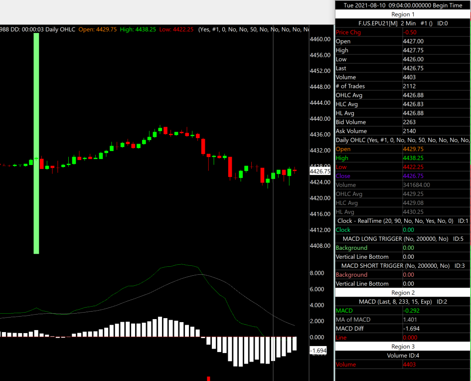 Good morning, I am attempting to use the Daily OHLC study and cannot seem to find a way to get it to display on the main graph with the candlesticks. For what it is worth, I tried using VWAP and it will not display either. Updated to version 2292 this morning. Worked through most trouble shooting documents and posts in the support board to no avail. Please help, Thanks. First image is Region 1 without the OHLC lines graphed but showing correct values in Chart Values window. Second image is the Daily OHLC settings. Third image is Daily OHLC subgraph settings. |