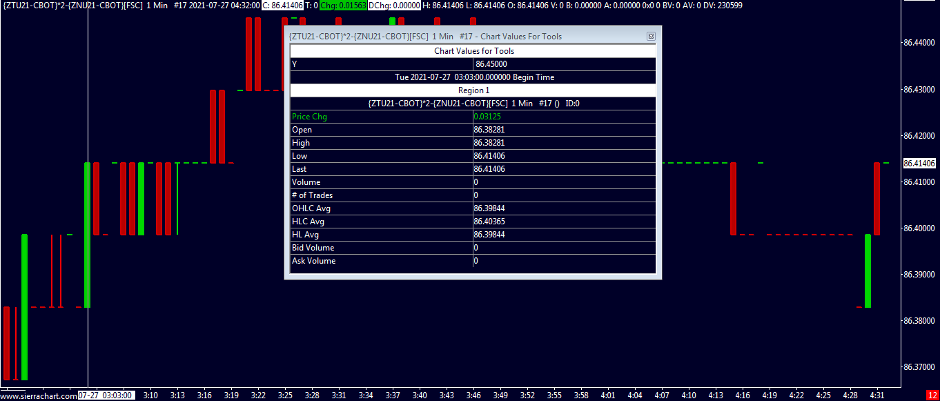 I created a custom symbol based on the 2-year and 10-year bonds, ZT and ZN, using the formula: {ZNU21-CBOT}*2-{ZNU21-CBOT} Plotting the symbol as candlestick bars, it normally works correctly. However, occasionally it throws up some anomalies like the one in the screenshot http://www.sierrachart.com/image.php?Image=1628635256125.png Note: chart times are in Central European Time (NY + 6) The open and close values are correct based on the corresponding values of ZT and ZN for that bar, but the high and low are obviously reversed, with the high showing a lower value than the low. Is there any way to correct this? |