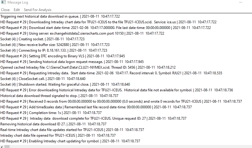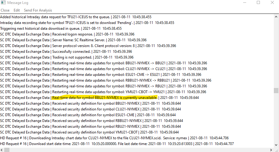 Hi the symbols are BB (Brent Crude Oil) and RBB ( Gasoline Brent Crack Spreads) _________________________________________________ DTC Protocol Server feature not enabled for Sierra Chart account. | 2021-08-11 08:32:57.403 * Reading Internal Order ID file. | 2021-08-11 08:32:57.403 Reading Trade Orders file. | 2021-08-11 08:32:57.567 Reading Trade Positions file. | 2021-08-11 08:32:57.568 Reading Trade Account Data files. | 2021-08-11 08:32:57.569 UDPListener (1716). Port 22904 | Listening on UDP port 22904. | 2021-08-11 08:32:57.625 Software version: 2253 64-bit | 2021-08-11 08:32:57.625 Primary Thread ID: 10388 | 2021-08-11 08:32:57.625 Usage end date: 2021-09-08 | 2021-08-11 08:32:57.625 Enabled for: Sierra Chart Historical Data Service. | 2021-08-11 08:32:57.625 Enabled for: Delayed Denali Exchange Data Feed. | 2021-08-11 08:32:57.625 Allow Support for Sierra Chart Data Feeds is disabled. | 2021-08-11 08:32:57.625 Current selected Data/Trading service: SC Data - All Services | 2021-08-11 08:32:57.625 Custom symbol settings values: enabled | 2021-08-11 08:32:57.625 Chart Update Interval: 500 | 2021-08-11 08:32:57.625 Intraday Data Storage Time Unit: 0 | 2021-08-11 08:32:57.625 Time Zone: +00:00:00 (UTC+00) | 2021-08-11 08:32:57.625 2021-08-11 08:32:57 Local computer time in UTC | 2021-08-11 08:32:57.625 2021-08-11 08:32:57 Local computer time in SC Time Zone | 2021-08-11 08:32:57.625 2021-08-11 08:32:55 Server time in UTC | 2021-08-11 08:32:57.625 Local computer UTC time and Server UTC time difference: 1 seconds. | 2021-08-11 08:32:57.625 Program path: C:\SierraChart\ | 2021-08-11 08:32:57.625 Data Files path: C:\SierraChart\Data\ | 2021-08-11 08:32:57.625 OS Version Number: 10.0 | 2021-08-11 08:32:57.626 Locale Setting: C | 2021-08-11 08:32:57.626 DLLs: MAutoFloorCeiling.dll, MAutoFloorCeiling_2158.dll, MAutoFloorCeiling_2158_64.dll, MAutoFloorCeiling_64.dll, MBidAskOscillator.dll, MBidAskOscillator_2158.dll, MBidAskOscillator_2158_64.dll, MBidAskOscillator_64.dll, MBoxChart.dll, MBoxChart_2158.dll, MBoxChart_2158_64.dll, MBoxChart_64.dll, MBoxHistogram.dll, MBoxHistogram_2158.dll, MBoxHistogram_2158_64.dll, MBoxHistogram_64.dll, MCumulativeDelta.dll, MCumulativeDelta_2158.dll, MCumulativeDelta_2158_64.dll, MCumulativeDelta_64.dll, MGannSwing.dll, MGannSwing_2158.dll | 2021-08-11 08:32:57.634 Allowed protected custom studies: | 2021-08-11 08:32:57.634 Checking for new symbol settings. Requested symbol settings MD5 for service code scdataallservices. Request ID: 1. | 2021-08-11 08:32:57.725 Received 5 login tokens. | 2021-08-11 08:32:58.011 HTTPS connection ID:1 to login.sierrachart.com:443 for request ID:1 (1) | Shutdown started. Waiting for graceful close. | 2021-08-11 08:32:58.021 HTTPS connection ID:1 to login.sierrachart.com:443 for request ID:1 (1) | Socket gracefully closed by remote side. | 2021-08-11 08:32:58.062 HTTPS connection ID:1 to login.sierrachart.com:443 for request ID:1 (1) | Closed. | 2021-08-11 08:32:58.062 Symbol settings MD5 received. Request ID: 1. | 2021-08-11 08:32:58.535 Requested symbol settings for service code scdataallservices. Request ID: 2. | 2021-08-11 08:32:58.535 Symbol settings received. Request ID: 2. | 2021-08-11 08:32:59.472 SC Data - All Services | Connected to server complete. | 2021-08-11 08:33:04.023 Triggering next historical data download in queue. | 2021-08-11 08:33:04.023 Triggering next historical data download in queue. | 2021-08-11 08:33:04.023 Triggering next historical data download in queue. | 2021-08-11 08:33:04.023 Triggering next historical data download in queue. | 2021-08-11 08:33:04.023 No download requests in the queue to start downloads for. | 2021-08-11 08:33:04.026 No download requests in the queue to start downloads for. | 2021-08-11 08:33:04.026 No download requests in the queue to start downloads for. | 2021-08-11 08:33:04.026 No download requests in the queue to start downloads for. | 2021-08-11 08:33:04.026 RBU21-NYMEX 30 Min #1 | Reloading chart. | 2021-08-11 08:33:12.259 + Loading additional symbol data. | 2021-08-11 08:33:12.747 Loading DLL: C:\SierraChart\Data\MWaveChart.dll (MWaveChart_2158_64.dll). Handle: 707c0000 | 2021-08-11 08:33:12.763 Loading DLL: C:\SierraChart\Data\MPace.dll (MPace_2158_64.dll). Handle: 65040000 | 2021-08-11 08:33:13.081 CLU21-NYMEX 30 Min #2 | Reloading chart. | 2021-08-11 08:33:13.110 RBU21-NYMEX 30 Min #3 | Reloading chart. | 2021-08-11 08:33:13.175 RBU21-NYMEX 1 Day #1 | Reloading chart. | 2021-08-11 08:33:13.415 CLU21-NYMEX 1 Day #2 | Reloading chart. | 2021-08-11 08:33:13.500 RBU21-NYMEX 1 Day #3 | Reloading chart. | 2021-08-11 08:33:13.533 YMU21-CBOT 30 Min #1 | Reloading chart. | 2021-08-11 08:33:13.878 ESU21-CME 30 Min #2 | Reloading chart. | 2021-08-11 08:33:14.490 RBBU21-NYMEX 30 Min #3 | Reloading chart. | 2021-08-11 08:33:14.518 RBU21-NYMEX 30 Min #3 | StartDateTimeForLoadingOrderFills: 00:00:00 | 2021-08-11 08:33:14.533 + Loading additional symbol data. | 2021-08-11 08:33:14.575 RBU21-NYMEX 1 Day #3 | StartDateTimeForLoadingOrderFills: 00:00:00 | 2021-08-11 08:33:18.582 RBBU21-NYMEX 30 Min #3 | Currently no data in file to display. Will start historical data download and real-time updates. File: C:\SierraChart\Data\RBBU21-NYMEX.scid | 2021-08-11 08:33:18.597 RBU21-NYMEX 30 Min #1 | StartDateTimeForLoadingOrderFills: 00:00:00 | 2021-08-11 08:33:18.601 Mapping CLU21-NYMEX to CLU21. Service code: nymex | 2021-08-11 08:33:18.601 SC DTC Delayed Exchange Data | Starting real-time market data updates for: CLU21-NYMEX (CLU21). ID: 1 Service code: nymex | 2021-08-11 08:33:18.602 SC DTC Delayed Exchange Data | Connecting to the server ds21.sierracharts.com. Port 10043 | 2021-08-11 08:33:18.602 SC DTC Delayed Exchange Data | Requesting security definition data for: CLU21-NYMEX (CLU21). ID: 1 | 2021-08-11 08:33:18.602 Starting DelayedDownloadMonitoringTimer | 2021-08-11 08:33:18.602 Starting HDTimeoutTimer | 2021-08-11 08:33:18.602 Added historical Intraday data request for CLU21-NYMEX