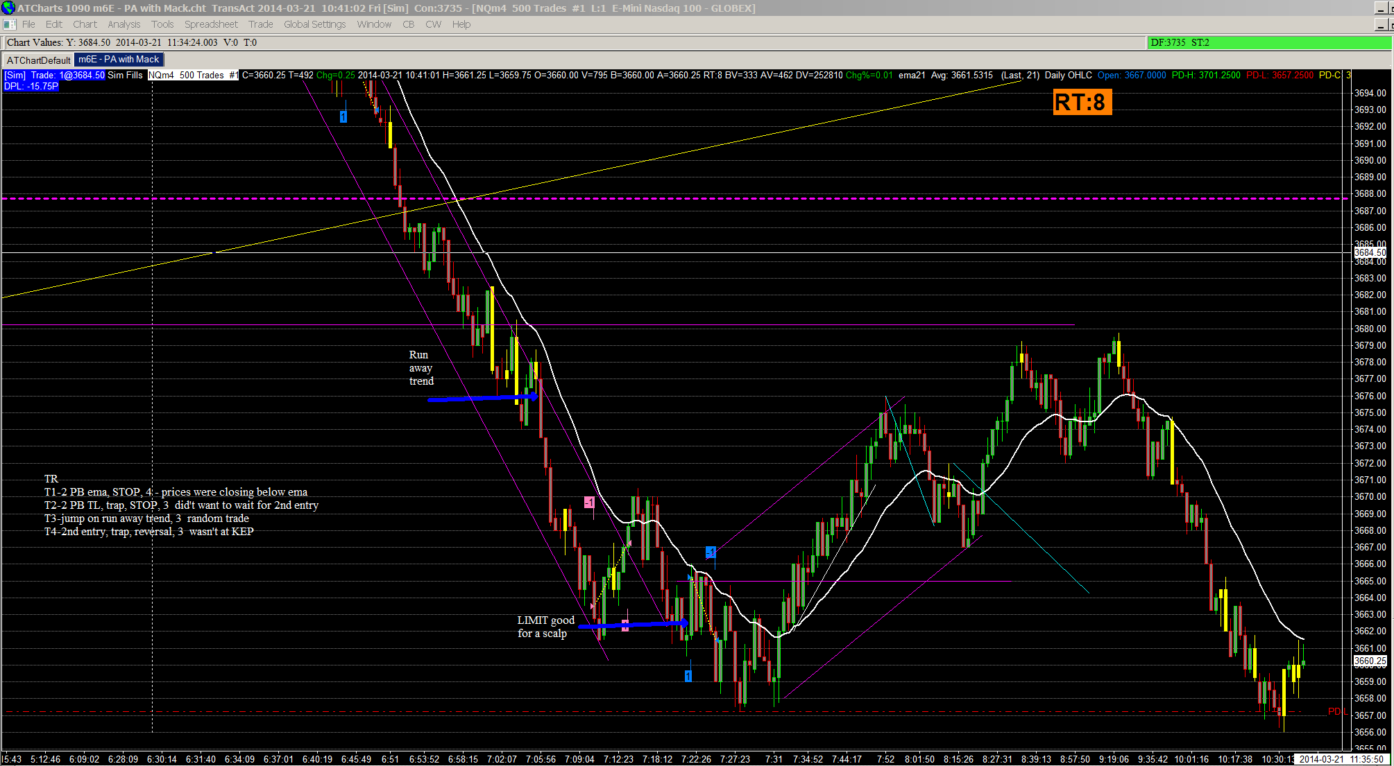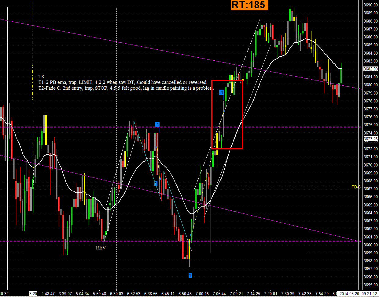 Attached is a 500T chart of NQM4 at 7:07 PT I noticed that my Target was filled but the candle had not reached the target. i.e. I was trading LIVE, I got a notice from Transact telling me my target profit LIMIT order was filled but on my 500T NQM4 chart the candle showed that this was not possible. about 1/2 second later the candle painted. I am looking for a way of speeding up my candle painting 1. my environment - Transact data feed I7 quad core computer (usually about 1% or 2% load on cores) 6 GB RAM (usually about 25% used) Sierra Charts #3 for chart trading 6 Mbps DSL line I live in rural B.C. Canada (maybe 1500 miles from Chicago) a ping of Chicago Servers using Speedtest.net shows 86 ms. my chart only has OHLC, ema21 and I am not using any automated studies. I am downloading $tick and $trin which I would turn off if I know how to do this. 2. since the notification of the fill of my profit target occurred about 1/2 second before the candle was painted, it would seem my data feed is fast enough. Is there anyway of painting my candles faster with Sierra Chart. 3. I only noticed this on the filling of my target profit, but presumably I am being affected also when I place an order for trade entry. |