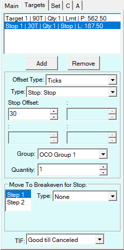 I have attached a screenshot I am trying to save OCO configurations and have created a stop of 30 ticks and target of 90 ticks I am looking to, move my stop automatically to B/E after price has moved 60 ticks and then stop stays at 60 ticks till target is hit or i get stopped out at 60 ticks. As per my understanding under Move to Breakeven for stop i need to: 1) Select Step 1 2) Select Offset in Ticks Triggered 3) BE Level Offset - i guess this would be 60 ticks based on the above mentioned 4) Trigger offset - i am not clear what this is |
