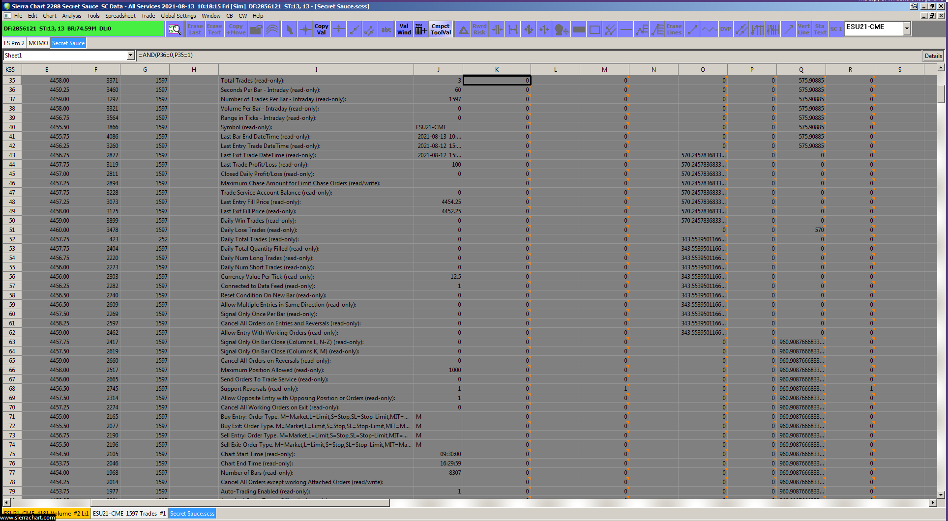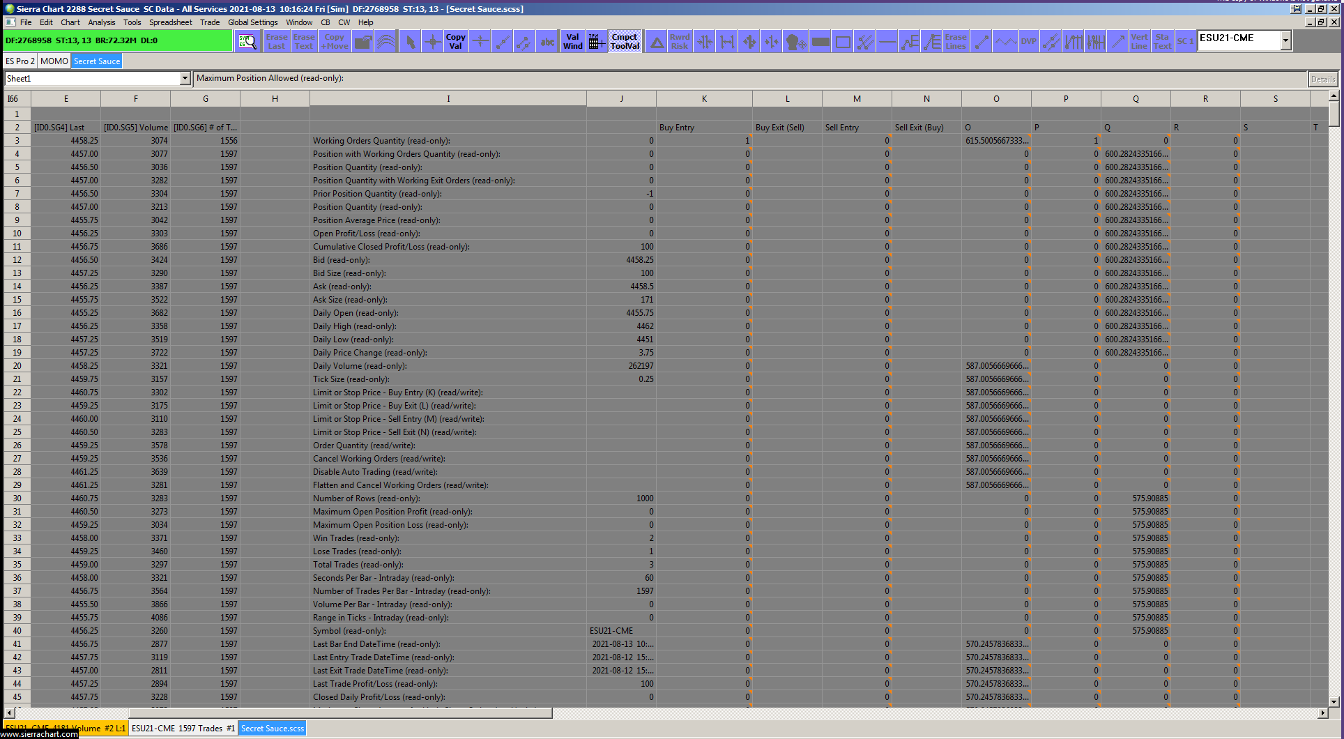 My Trading System works; however, it does not ever send more than 1 lot. I've poured through the documentation on the Spreadsheet For Trading System study, as well as atttached orders, then searched the support board, but I still cannot get it to work. I'll spare you a lengthy message of all the troubleshooting/variables I've tried, & just attach screenshots of the Trade Window on the chart with the spreadsheet study, images of the I & J columns for the spreadsheet study, & the settings for the spreadsheet study. Hopefully that will help easily identify the problem. If not, I'll provide whatever answers you need. Thank you in advance, this has really been frustrating. The images from the spreadsheet are: http://www.sierrachart.com/image.php?Image=1628864185652.png http://www.sierrachart.com/image.php?Image=1628864297267.png http://www.sierrachart.com/image.php?Image=1628864297267.png |