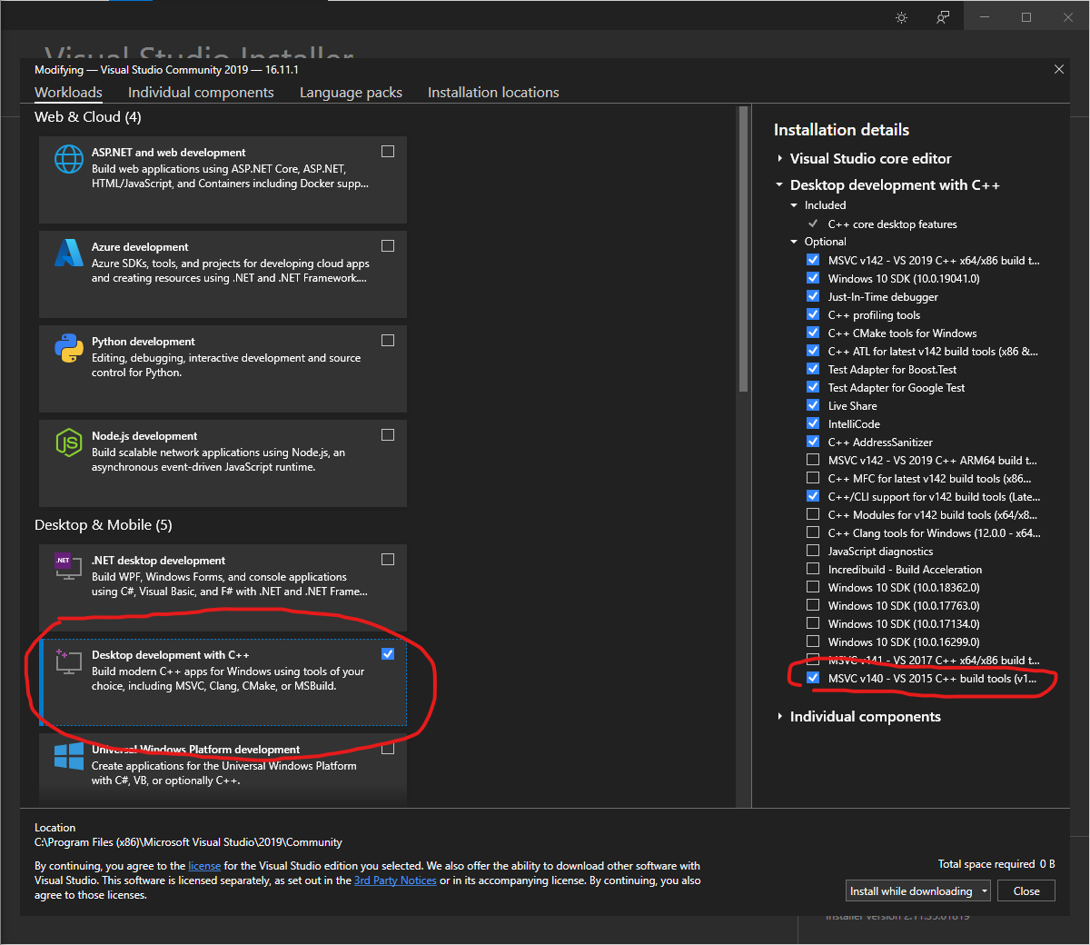 Thanks! I have managed to set up the Visual C++ debugging properly. In the Visual Studio Installer I had to download the "MVSC v140 - VS 2015 C++ built tools (v14.0)" installation from the "Desktop development with C++" category (attached photo). I think it might help other users in the future if You include this information somewhere in the documentation. |