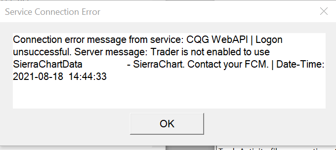 You are not setup with CQG to use Sierra Chart. You need to tell your broker to get you setup properly. Refer to the information here: CQG Trading Platform Service: CQG Account Requirements For the most reliable, advanced, and zero cost futures order routing, use the Teton service: Sierra Chart Teton Futures Order Routing |
