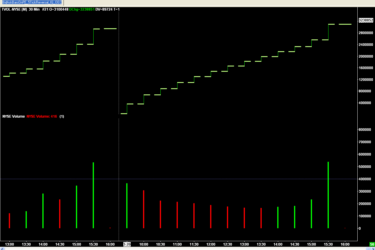 Hello, Here is a study that will break down the NYSE volume chart (symbol: TVOL-NYSE) just like a regular price chart. Put the dll file in your data directory and load it from "Add Custom Study." --WT |