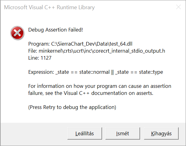 Hi! When I want to write text to the Chart, and the text includes "%", the Sierra Chart crashes, or when I try to debug, the debug indicates error (Error.png attached). I read the documentation here, and there is nothing mentioned about writing percent signs. Using Drawing Tools From an Advanced Custom Study: s_UseTool::Text The SCString's documentation here says: ACSIL Programming Concepts: SCString Methods "The Format() function overwrites the contents of the SCString object according to the given parameters. This function works the same as the C++ Standard Library printf() function." But when using printf() I can write percent signs ("%%"). The following code will demonstrate my claim: #include "sierrachart.h"