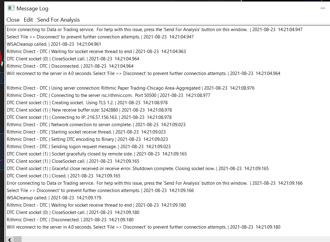 We have already contacted Rithmic about this. We do not know what the issue is at this point in time. We do not need to see the Message Log.