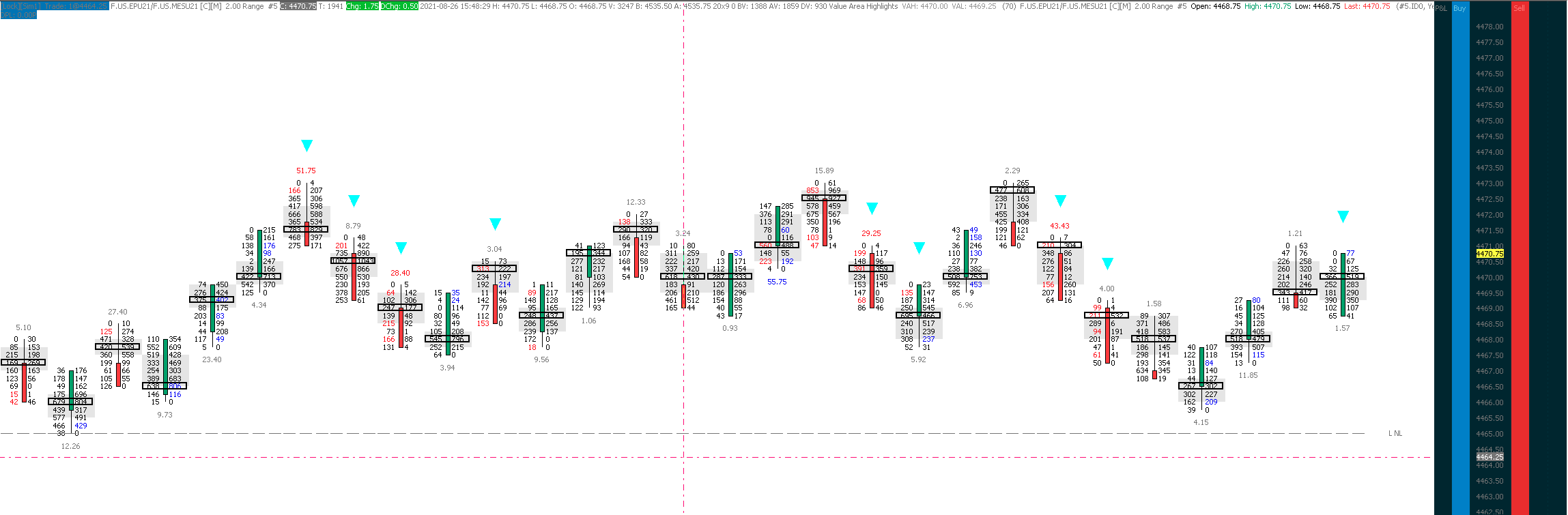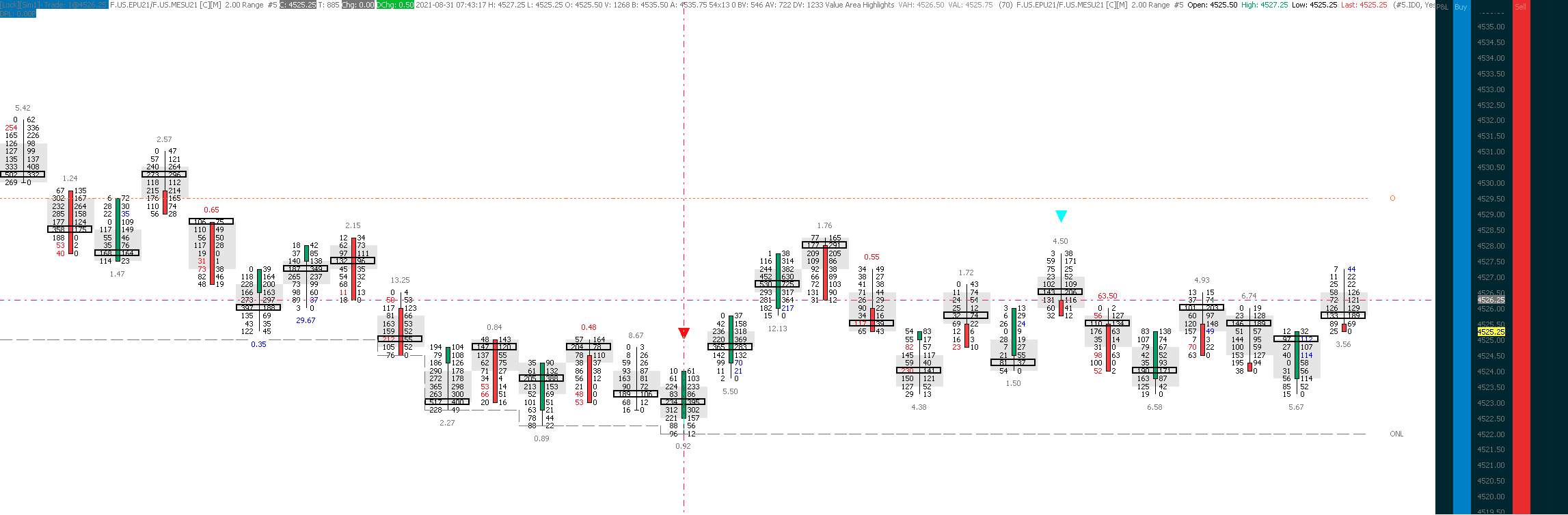 Thank you for providing such a solid trading platform. I've been using alert formulas for quite some time now with great success. Recently I found that when using the BVAP and AVAP commands in the color bar based on alert condition study, the system was not behaving consistently with the formula output. I asked the alert to fire when BVAP at one price level was > or < or = the BVAP of the similar level one or more candles back. I tried each comparison (<,>,=) separately and found similar issues with the comparisons made by the system. As a simple example, I made a chart with the following formulas as separate studies (again, the errors occur whether <,>,= is used): =(BVAP(H[-1],0))=(BVAP(H,0)) this results in a teal arrow down above the high when true and the other with: =(BVAP(H[-3]-(TICKSIZE*1),0))=(BVAP(H-(TICKSIZE*1),0)) this results in a red arrow down above the high when true The issue is that the alert sometimes fires correctly, at times misses signals, and at times fires when the formula would have been false. I have a simplified Chartbook I can provide if you need it. I have attached some screen grabs that illustrate the scenarios and have made commentary on the images. As a final note, I am running version 2299 on an M1 Mac Mini via Codeweavers Crossover (Version 20.0.4 (20.0.4.33197)) and I use the Denali Feed for CME ticker data and recently added the Sierra Feed for CBOE, etc. if any of that comes to bear. Highest Bid Comparison Bid Comparison 1 tick below High 3 bars back |