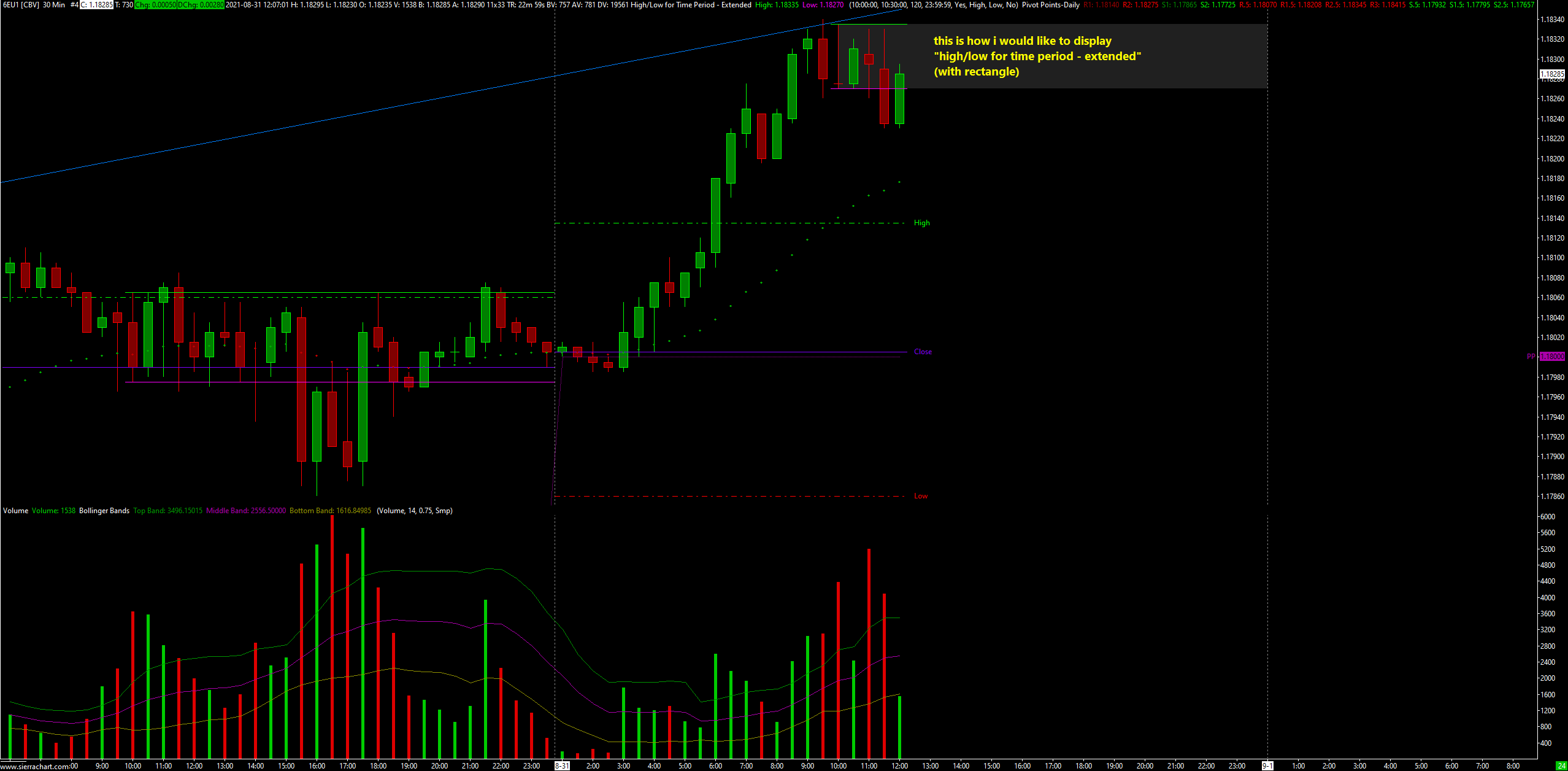 We really are not understanding this. Unless a drawing is a Ray or an Extending Rectangle, it is not going to extend forward. For example, I want the rectangle to be drawn on the first 30min of UK and NY session opening, till the end of the day for every day. Refer to this study:High/Low for Time Period Use this link: https://www.sierrachart.com/SupportBoard.php?do=ViewPosts Sierra Chart Support - Engineering Level Your definitive source for support. Other responses are from users. Try to keep your questions brief and to the point. Be aware of support policy: https://www.sierrachart.com/index.php?l=PostingInformation.php#GeneralInformation For the most reliable, advanced, and zero cost futures order routing, *change* to the Teton service: Sierra Chart Teton Futures Order Routing |