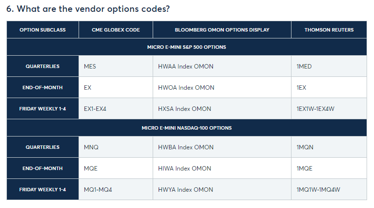 One last question (I hope!): In looking over the available options contracts, I see everything available for ES, but I can't find the available options contracts for MES. I was specifically looking for the MES Friday weeklies, product code EX1 - EX4, but I don't see any EX options at all. I'm looking under "Futures Options - CME (Denali Data)" and don't see anywhere else the MES options might be hiding. Are MES options not traded through the CME? Date Time Of Last Edit: 2021-09-01 23:23:03