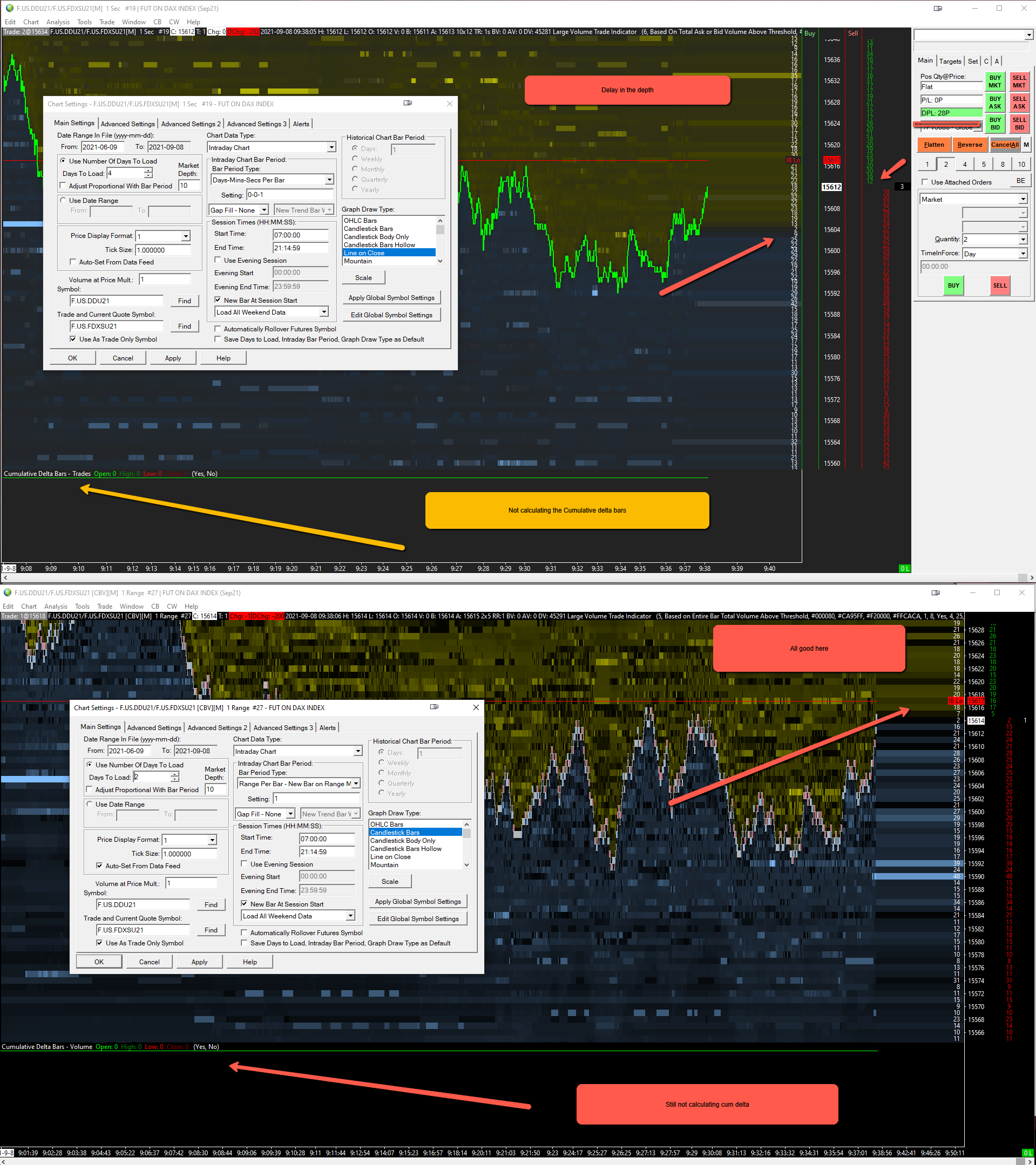 Hi Pls help, Running 2 windows with historical depth, same settings. Cumulative delta can not be calculated, and there is a delay in the top chart... Many thanks |