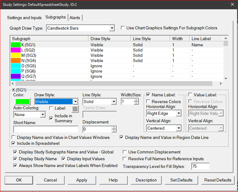 Note: I'm not SC Support. I am only a user. Try this: - Set 'Use Price Graph Style' to Yes. This plots OHLC candlestick bars from values in columns K-N where: Column K is the Open Column L is the High Column M is the Low Column N is the Close - Set Subgraph colors: K/SG1: Green L/SG2: Light Green M/SG3: Red N/SG4: Light Red - Formulas on the spreadsheet: K3: =OFFSET(N3,9,0) L3: =MAX(N3:N12) M3: =MIN(N3:N12) N3: =(SUM(BE3:BE12)-SUM(BC3:BC12))/(SUM(BE3:BE12)+SUM(BC3:BC12)) K3 is the Open of the 10 bar array because it is the first bar of the 10 bar offset of the Close. (The OFFSET function is not inclusive, so 9 gets the 10th bar.) L3 is the High of the 10 bar array because it is the max of the array. M3 is the Low of the 10 bar array because it is the min of the array. N3 is the Close of the 10 bar array because it is the current bar. Date Time Of Last Edit: 2021-09-10 14:36:35
