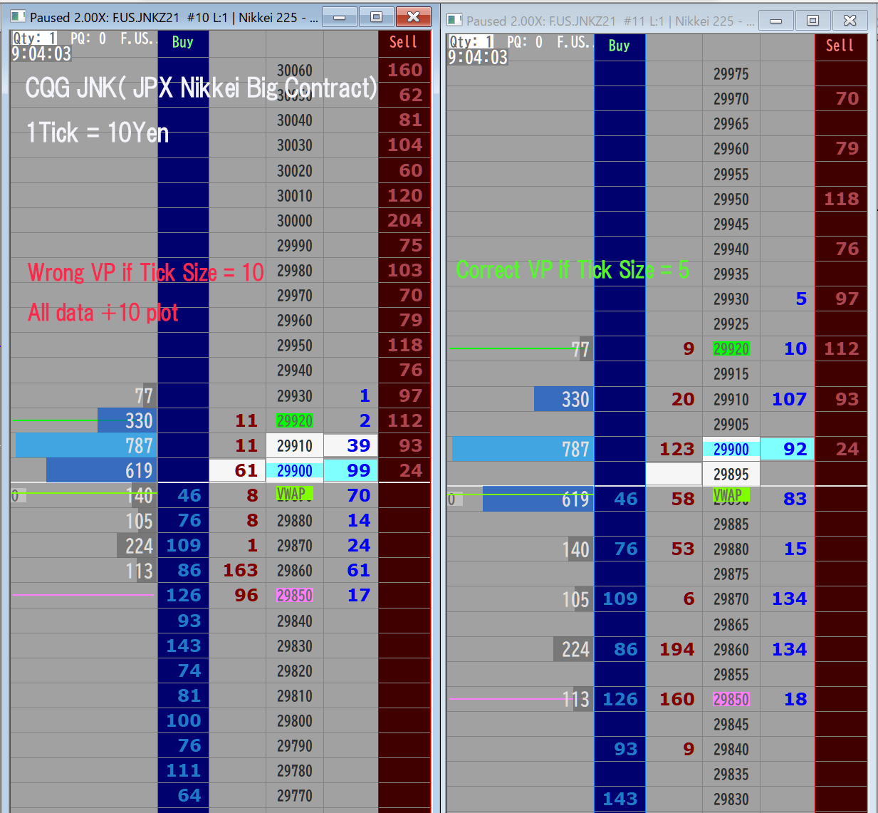 Incorrect Volume Profile data plot at JNK(CQG) Nikkei Big Contract. If "Chart Settings > Tick Size" set to 5 then VP plot is correct, but JNK contract correct tick size is 10. If "Chart Settings > Tick Size" set to 10 then all VP plot is +10 point form correct price. This issue also arise MJNK(mini Nikkei contract). if "Chart Settings > Volume at price multi" set to 2 then all VP plot is +10 point form correct price. Please fix this. |