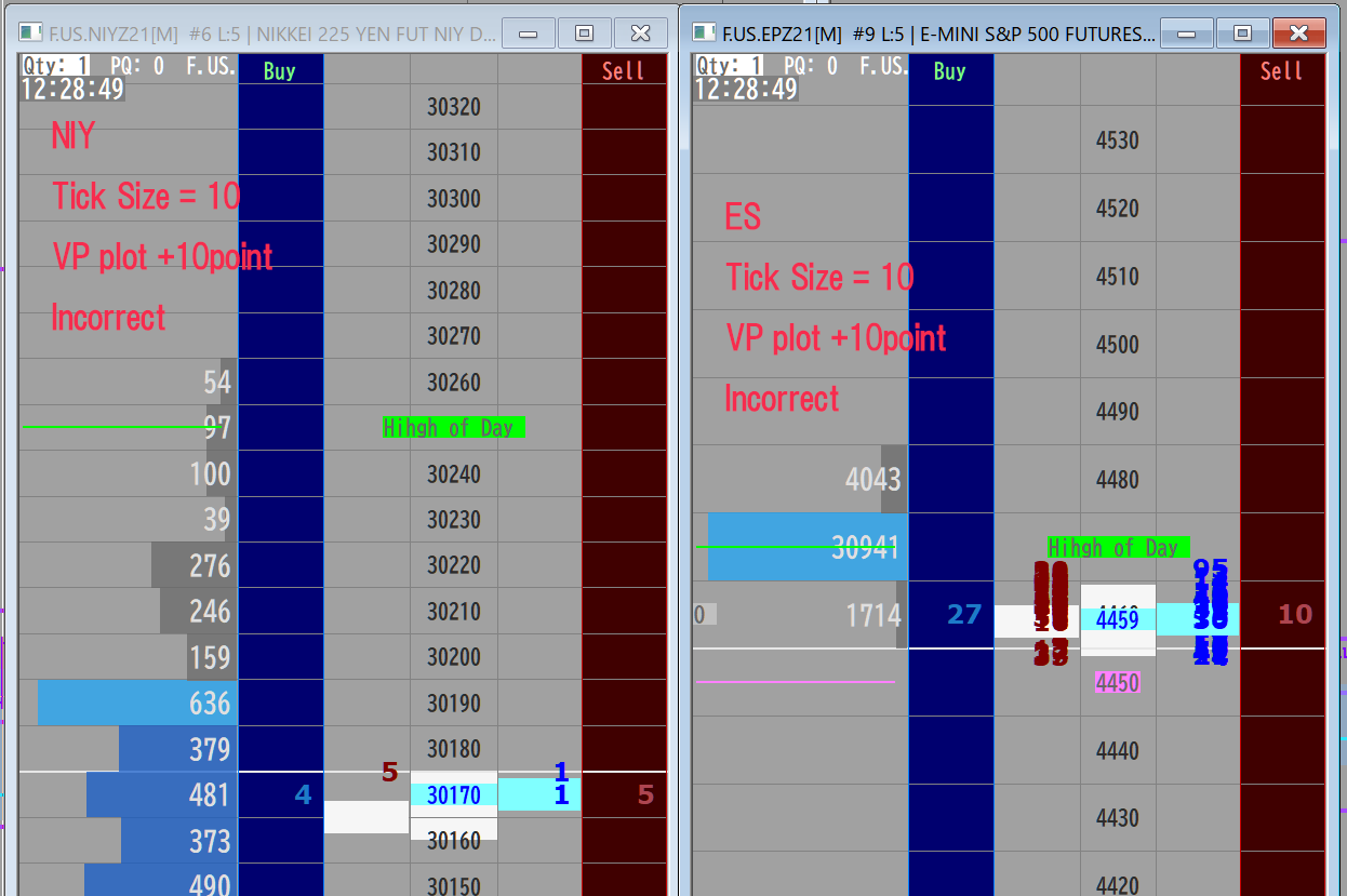 Here is ES and NIY(CME Nikkei YEN). This is Denali Exchange Data feed data. I am not subscribe CME data from CQG, only Denali feed. If "Chart Settings > Tick Size" set to 10 then all VP plot is +10 point form correct price. You can see the High of Day(correct) and VP plot(incorrect) is not aligned. This is very clear, Volume By Price Study can not handle correctly when Tick Size = 10. This is not CQG problem. Please fix this. Date Time Of Last Edit: 2021-09-13 03:50:37