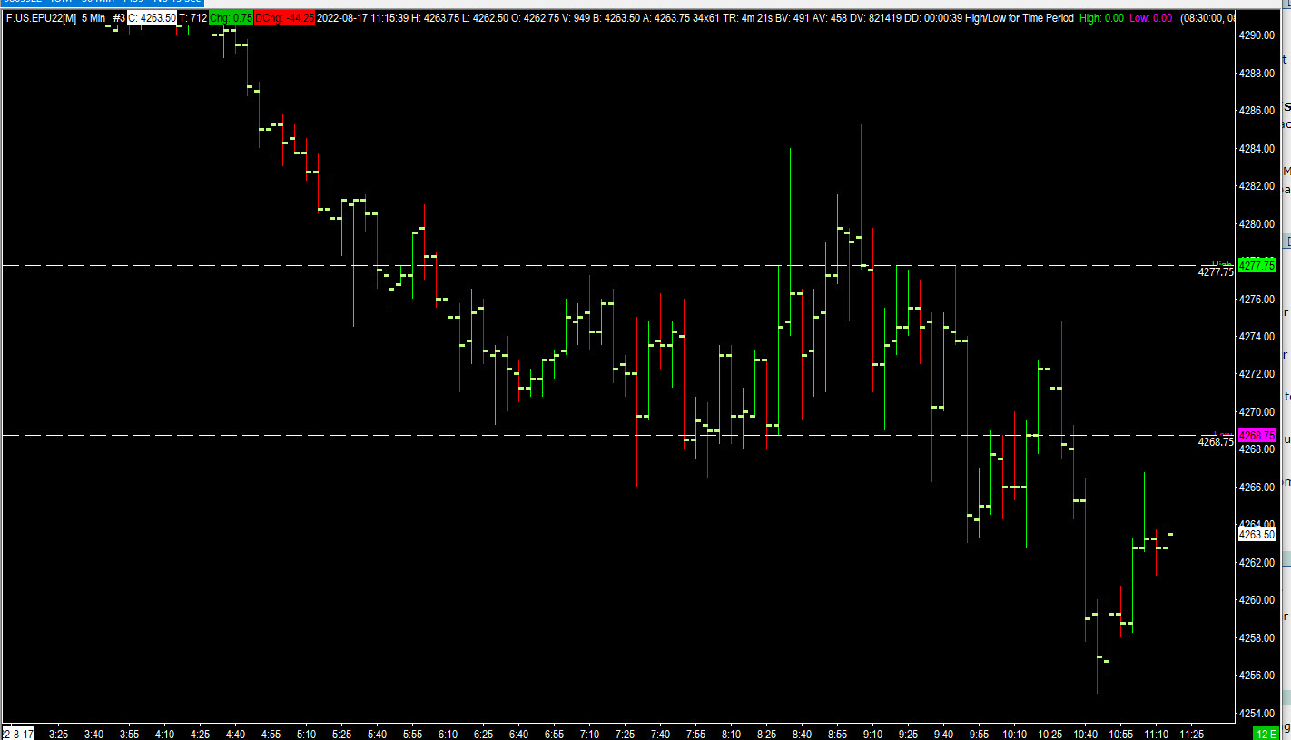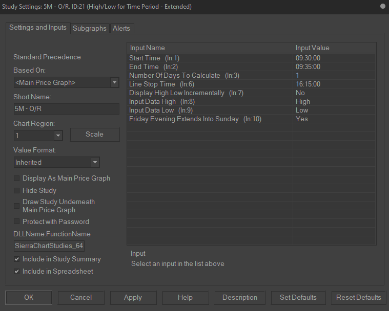 We see a couple of issues. First, the entry for the End Time of the High Low for Time Period - Extended should not be at the beginning of a bar. It needs to be 1 second prior to the start of a bar in order to capture the actual data from the 5 minutes between 09:30:00 and 09:35:00. In other words, the end time needs to be 09:34:59. Otherwise, you are including the data from the bar that starts at 09:35:00 and goes to 09:39:59. Second, when you change the chart to a 2 minute chart, the High Low for Time Period - Extended study has the same issue with the data, in that you define the End Time at a time that is in the middle of a bar, therefore the entire bar is taken into account, which actually takes you to 09:35:59. Therefore, you either need to have a chart that is evenly divisible by the time period defined in the High Low for Time Period study, or the opposite, the time period needs to match up with the chart time. All of this is explained in the following section of the documentation for that study: High/Low for Time Period - Extended: High/Low Accuracy For the most reliable, advanced, and zero cost futures order routing, use the Teton service: Sierra Chart Teton Futures Order Routing Date Time Of Last Edit: 2021-09-30 00:41:31
