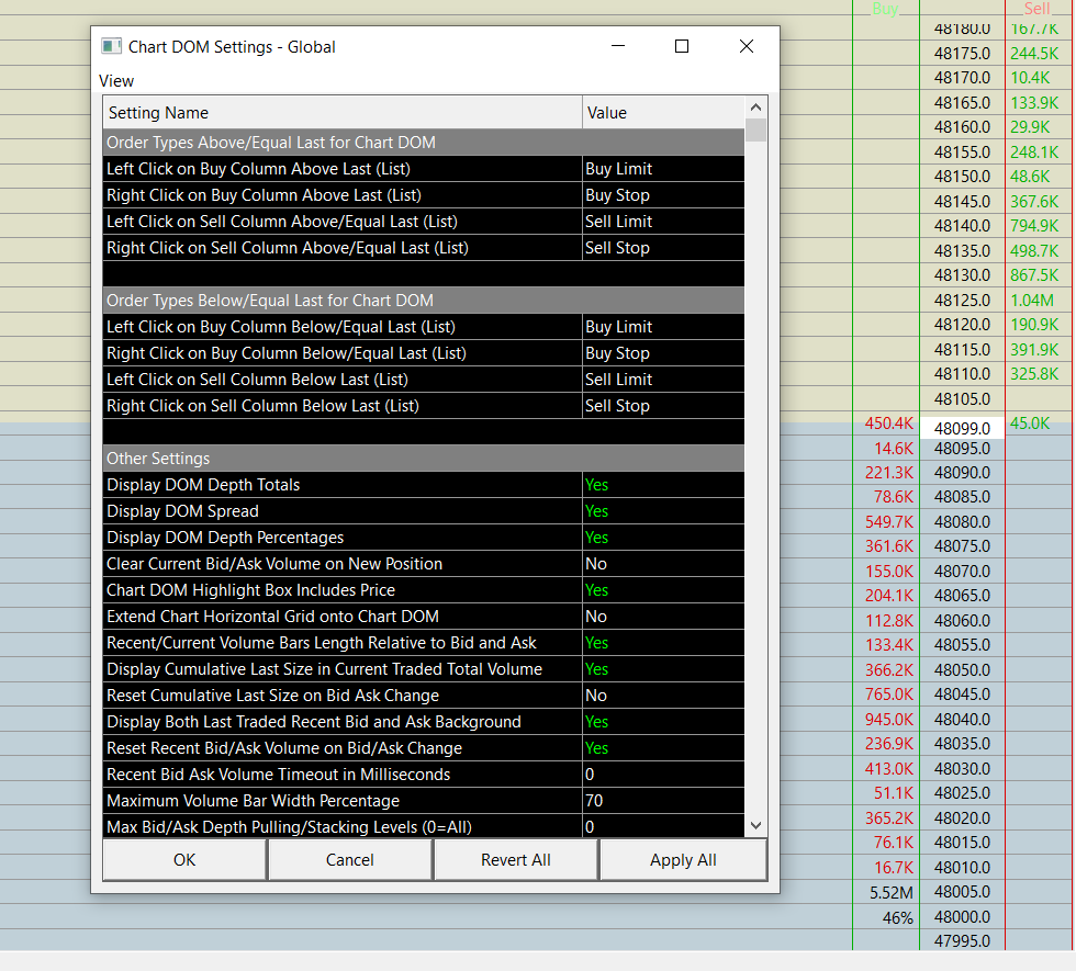 Volume Bar of Bid/Ask in Trading Dom not showing and there is no option in DOM setting. Played with all setting in Trading DOM Setting but cant get it. Check image.