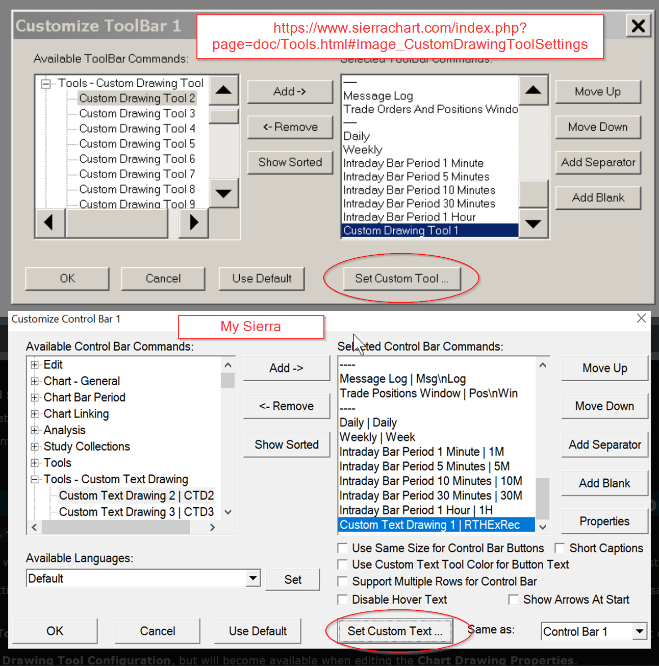 I am trying to set up a custom drawing button according to : https://www.sierrachart.com/index.php?page=doc/Tools.html#Image_CustomDrawingToolSettings I don't have a "Set Custom Tool" button. Instead I see a "Set Custom Text..." button. How to I set the drawing tool? See image. |