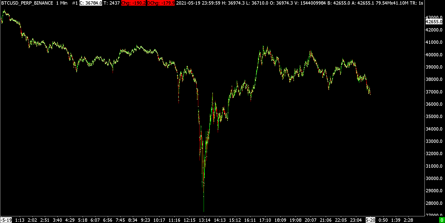 I have attached the Binance BTC/USDT 30min intraday chart from both Sierra & TradingView and the discrepancy still exists to the same extent. I have also attached the Bitfinex BTC/USD 30min intraday chart from Sierra as oddly enough it seems to be spot on, hitting that 30k low. All charts are from May 17th-24th. Thanks, |