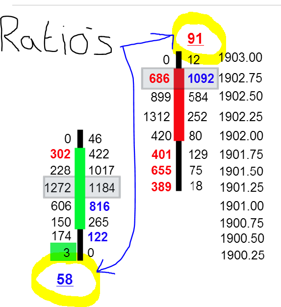 Hi Support, I use the Numbers Bars Study - as my Footprint - on a 10 tick range. One of things I like to look are the ratio's of the lowest 2 Bid values (for an up candle) and highest 2 Offer values (for a down candle). Is it possible to automate this calculation and display it as a value below / above each bar? (See attached as an example). Thanks, Alan. |