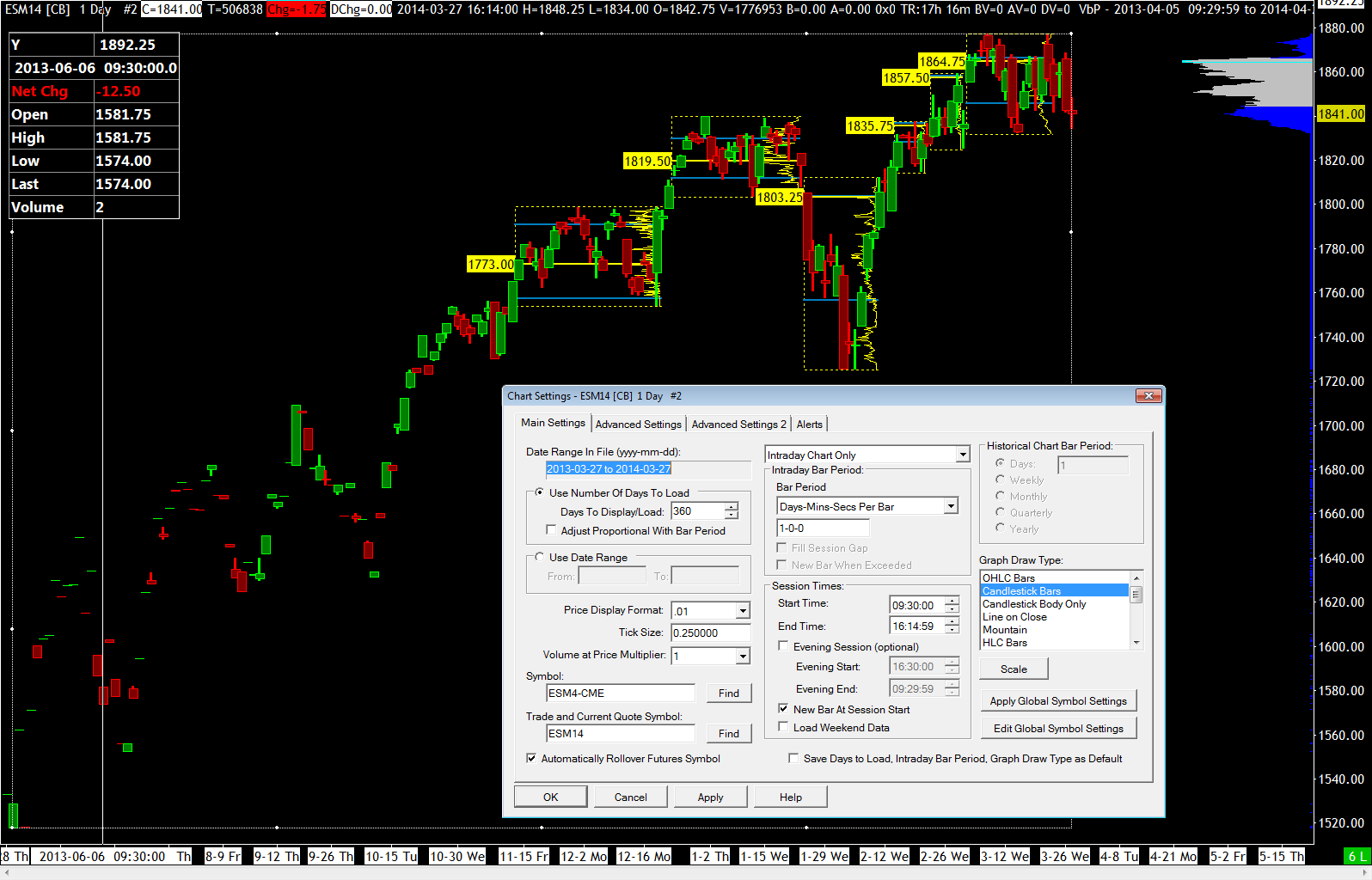 While disconnecting and reconnecting had no affect, exiting and restarting did bring up the symbol with the 'M' at the end. However data still is only going back to December2013, while 360 days are requested. After my charts loaded, I opened a new chart, changed it to Intraday Chart Only, 1-0-0 for the day session, ESM4-CME; it only goes back to Novermber 2013. Intraday charts have gappy bars. Log: Software version: 1112 | 2014-03-28 16:47:31 Usage end date: 2014-04-28 | 2014-03-28 16:47:31 Enabled for: Sierra Chart Historical Data Service. | 2014-03-28 16:47:31 Enabled for: Sierra Chart Real-Time Market Data Feed. | 2014-03-28 16:47:31 Enabled for: CME, CBOT, NYMEX, COMEX exchanges. | 2014-03-28 16:47:31 Received 1 data feed usernames. | 2014-03-28 16:47:31 Allow Support for Sierra Chart Data Feeds is enabled. | 2014-03-28 16:47:31 Active service: Rithmic Trading | 2014-03-28 16:47:31 Time Zone: -04:00:00 (EST-05EDT+01,M3.2.0/02:00,M11.1.0/02:00) | 2014-03-28 16:47:31 2014-03-28 16:47:31 Local computer clock time | 2014-03-28 16:47:31 2014-03-28 20:47:31 GMT time | 2014-03-28 16:47:31 2014-03-28 16:47:31 Time zone adjusted time | 2014-03-28 16:47:31 Time difference to server time: 5 seconds. | 2014-03-28 16:47:31 Program path: C:\SierraChart\ | 2014-03-28 16:47:31 Data Files path: C:\SierraChart\Data\ | 2014-03-28 16:47:31 OS Version Number: 6.1 | 2014-03-28 16:47:31 Checking for new symbol settings for rim | 2014-03-28 16:47:31 Symbol settings are up-to-date for rim | 2014-03-28 16:47:32 Date rule based rollover from ESM3-CME to next contract occurs at 2013-06-13 | 2014-03-28 16:47:34 Date rule based rollover from ESU3-CME to next contract occurs at 2013-09-12 | 2014-03-28 16:47:34 Date rule based rollover from ESZ3-CME to next contract occurs at 2013-12-12 | 2014-03-28 16:47:34 Date rule based rollover from ESH4-CME to next contract occurs at 2014-03-13 | 2014-03-28 16:47:34 Date rule based rollover from ESM4-CME to next contract occurs at 2014-06-12 | 2014-03-28 16:47:34 Intraday data file for ESM3-CME exists and is empty. Skipping Intraday data download. | 2014-03-28 16:47:34 Checking Daily data file for symbol ESM13 for the date range from 2013-03-07 to 2013-06-08 | 2014-03-28 16:47:34 Intraday data file for ESU3-CME exists and is empty. Skipping Intraday data download. | 2014-03-28 16:47:34 Checking Daily data file for symbol ESU13 for the date range from 2013-06-13 to 2013-09-07 | 2014-03-28 16:47:34 Intraday data file for ESZ3-CME exists and is empty. Skipping Intraday data download. | 2014-03-28 16:47:34 Checking Daily data file for symbol ESZ13 for the date range from 2013-09-12 to 2013-12-07 | 2014-03-28 16:47:34 Checking Intraday data file for symbol ESH4-CME for the date range from 2013-12-12 to 2014-03-13 | 2014-03-28 16:47:34 Checking Daily data file for symbol ESH14 for the date range from 2013-12-12 to 2014-03-08 | 2014-03-28 16:47:34 Checking Intraday data file for symbol ESM4-CME for the date range from 2014-03-13 to 0 | 2014-03-28 16:47:34 Checking Daily data file for symbol ESM14 for the date range from 2014-03-13 to 0 | 2014-03-28 16:47:34 Symbols used for ESM4-CME continuous contract chart: | 2014-03-28 16:47:34 ESM3-CME | 2014-03-28 16:47:34 ESU3-CME | 2014-03-28 16:47:34 ESZ3-CME | 2014-03-28 16:47:34 ESH4-CME | 2014-03-28 16:47:34 ESM4-CME | 2014-03-28 16:47:34 ESM4-CME [CB] 1 Day #2: Performing continuous futures contract back adjustment calculations. | 2014-03-28 16:47:34 ESM4-CME [CB] 1 Day #2: ESM3-CME Open price on 2013-06-13 is 1610.75. | 2014-03-28 16:47:34 ESM4-CME [CB] 1 Day #2: ESU3-CME Open price on 2013-06-13 is 1605. | 2014-03-28 16:47:34 ESM4-CME [CB] 1 Day #2: ESM3-CME price difference to ESU3-CME is -5.75. | 2014-03-28 16:47:34 ESM4-CME [CB] 1 Day #2: ESU3-CME Open price on 2013-09-12 is 1689.75. | 2014-03-28 16:47:34 ESM4-CME [CB] 1 Day #2: ESZ3-CME Open price on 2013-09-12 is 1683.25. | 2014-03-28 16:47:34 ESM4-CME [CB] 1 Day #2: ESU3-CME price difference to ESZ3-CME is -6.5. | 2014-03-28 16:47:34 ESM4-CME [CB] 1 Day #2: ESZ3-CME Open price on 2013-12-12 is 1780.75. | 2014-03-28 16:47:34 ESM4-CME [CB] 1 Day #2: ESH4-CME Open price on 2013-12-12 is 1774.25. | 2014-03-28 16:47:34 ESM4-CME [CB] 1 Day #2: ESZ3-CME price difference to ESH4-CME is -6.5. | 2014-03-28 16:47:34 ESM4-CME [CB] 1 Day #2: ESH4-CME Open price on 2014-03-13 is 1868.75. | 2014-03-28 16:47:34 ESM4-CME [CB] 1 Day #2: ESM4-CME Open price on 2014-03-13 is 1861.5. | 2014-03-28 16:47:34 ESM4-CME [CB] 1 Day #2: ESH4-CME price difference to ESM4-CME is -7.25. | 2014-03-28 16:47:34 ESM4-CME [CB] 1 Day #2: Back adjust amount for symbol ESM3-CME is -26. | 2014-03-28 16:47:34 ESM4-CME [CB] 1 Day #2: Back adjust amount for symbol ESU3-CME is -20.25. | 2014-03-28 16:47:34 ESM4-CME [CB] 1 Day #2: Back adjust amount for symbol ESZ3-CME is -13.75. | 2014-03-28 16:47:34 ESM4-CME [CB] 1 Day #2: Back adjust amount for symbol ESH4-CME is -7.25. | 2014-03-28 16:47:34 Date rule based rollover from ESM3-CME to next contract occurs at 2013-06-13 | 2014-03-28 16:47:35 Date rule based rollover from ESU3-CME to next contract occurs at 2013-09-12 | 2014-03-28 16:47:35 Date rule based rollover from ESZ3-CME to next contract occurs at 2013-12-12 | 2014-03-28 16:47:35 Date rule based rollover from ESH4-CME to next contract occurs at 2014-03-13 | 2014-03-28 16:47:35 Date rule based rollover from ESM4-CME to next contract occurs at 2014-06-12 | 2014-03-28 16:47:35 Intraday data file for ESM3-CME exists and is empty. Skipping Intraday data download. | 2014-03-28 16:47:35 Checking Daily data file for symbol ESM13 for the date range from 2013-03-07 to 2013-06-08 | 2014-03-28 16:47:35 Intraday data file for ESU3-CME exists and is empty. Skipping Intraday data download. | 2014-03-28 16:47:35 Checking Daily data file for symbol ESU13 for the date range from 2013-06-13 to 2013-09-07 | 2014-03-28 16:47:35 Intraday data file for ESZ3-CME exists and is empty. Skipping Intraday data download. | 2014-03-28 16:47:35 Check