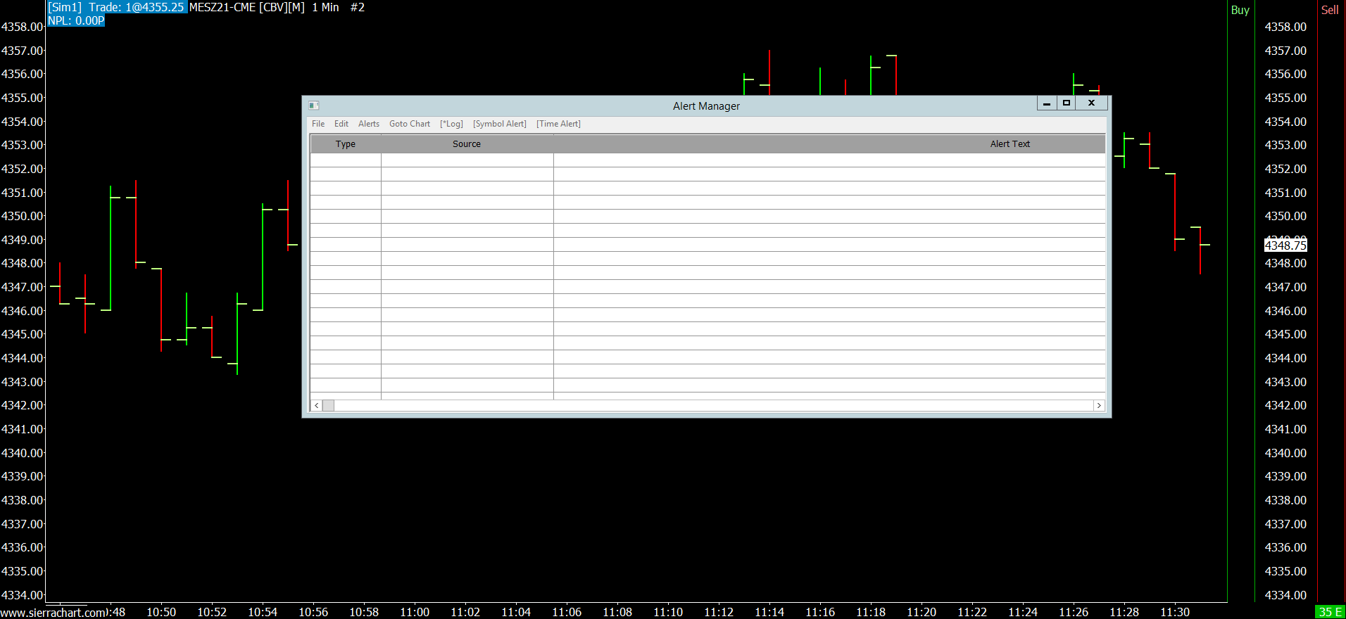To get us a screen image, open your Alert Manager and then select Edit >> Screen Images >> Upload Chart with Overlays. You will get a pop-up asking if you want to copy the path for the image to the clipboard - select Yes and then paste that path into this thread and submit the ticket. For example, here is an image we just tried to ensure that the Alert Manager would show: http://www.sierrachart.com/image.php?Image=1632846709221.png For the most reliable, advanced, and zero cost futures order routing, use the Teton service: Sierra Chart Teton Futures Order Routing Date Time Of Last Edit: 2021-10-10 06:13:12