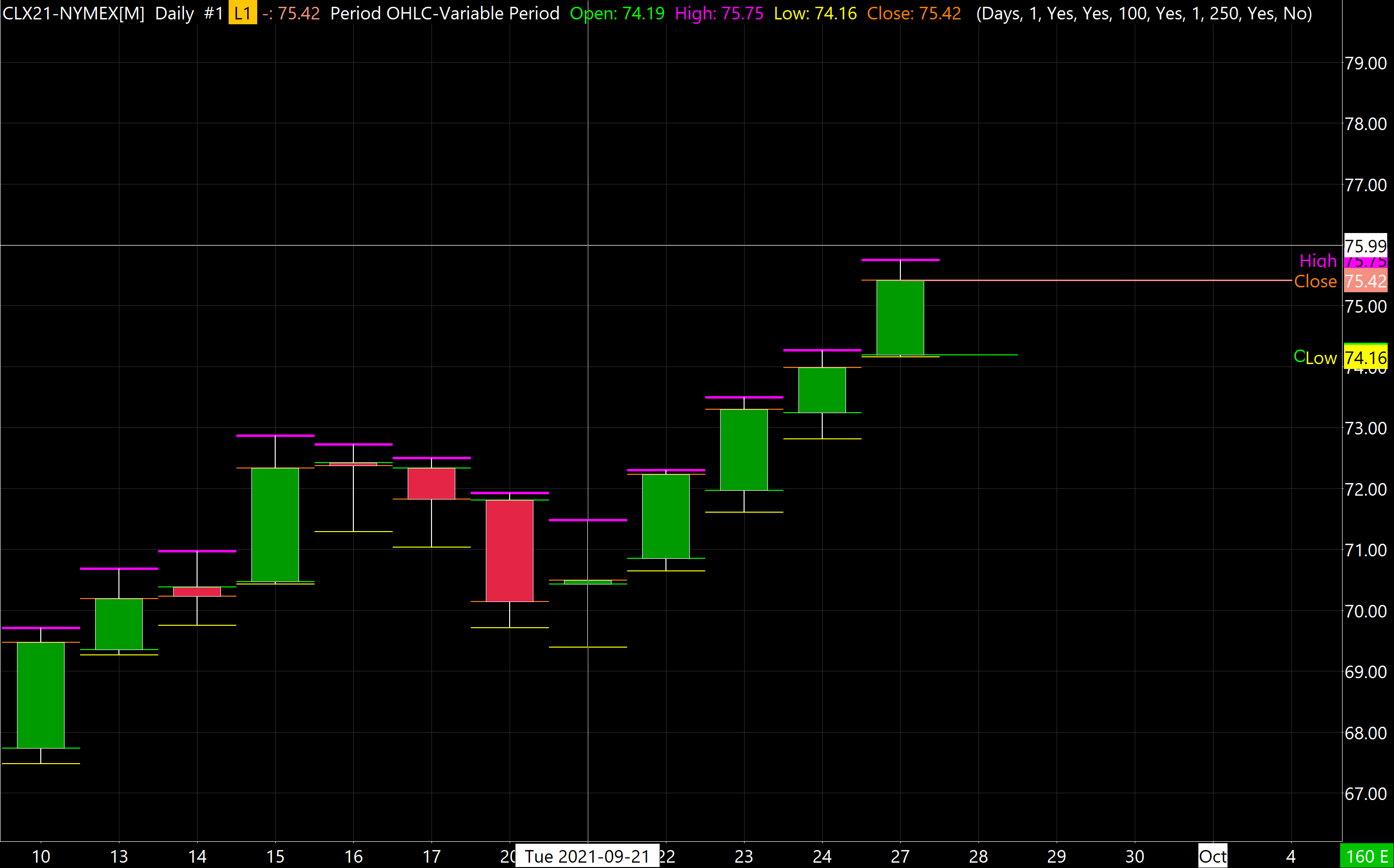 Hey so I am trying to 1: draw a "constant" horiztonal line to extend infinitely from left to right for every OHLC on a daily candle for say the last 30 or 60 daily candles. The closest I found was extend until further intersection and I don't want that, I want it to go from left to right across the screen, regardless of anything in the way. and finally 2: to be able to color each of of the 4 lines (high - low - close - open) independently, for example red for the high and blue for the low, light blue for close etc... I got pretty close with the "Period OHLC - Variable Period" study as attached below BUT only thing missing is that the lines are too short and no option to make them EXTEND accross left to right.. So exactly like this screenshot but jus make the lines stretch left to right infinetly http://www.sierrachart.com/image.php?Image=1632777200500.png THANK YOU Date Time Of Last Edit: 2021-09-27 21:14:53