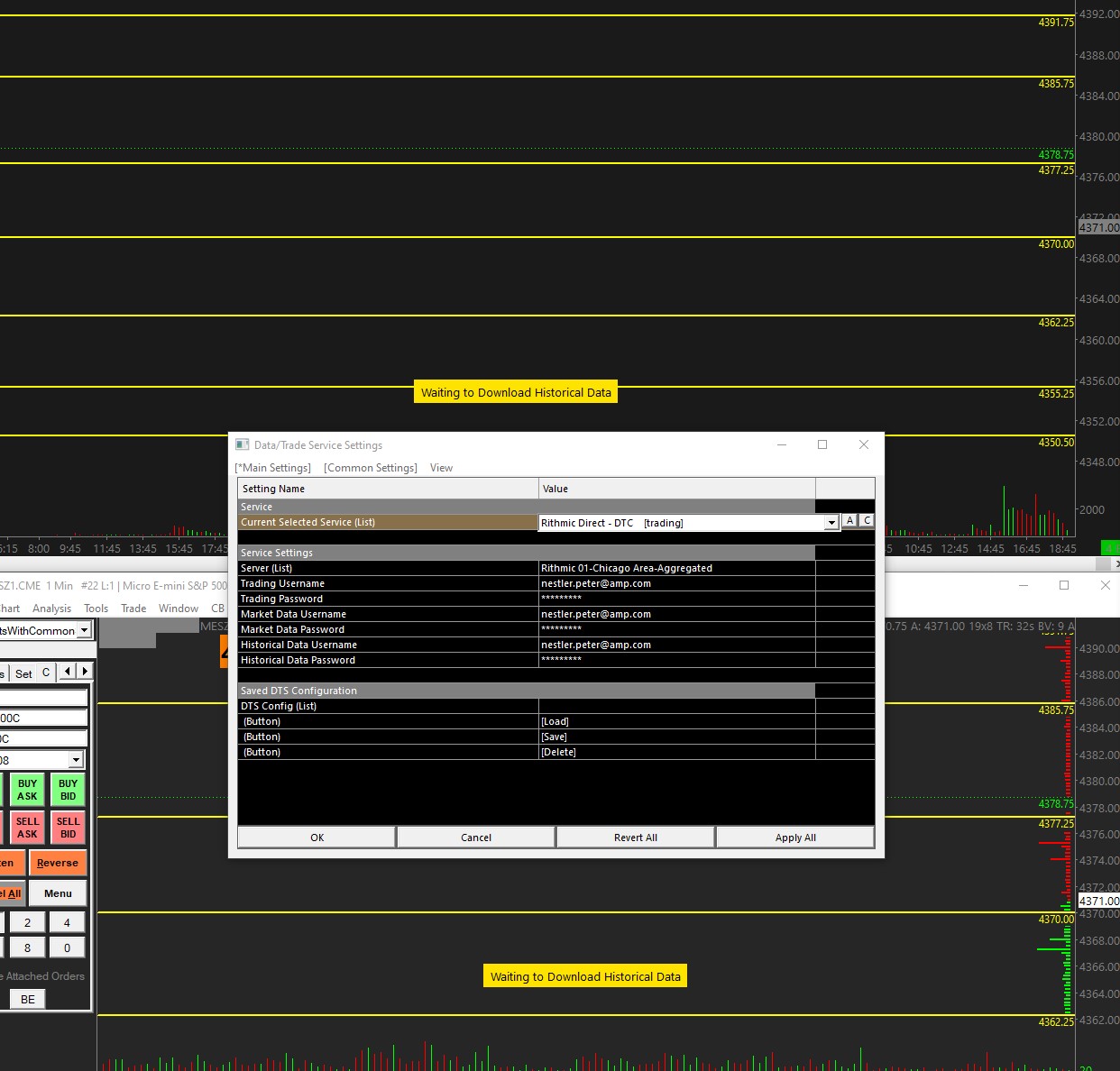 Hello Sierra Chart Team, when connecting to Rithmic-server (Service List Rithmic Direct - DTC) I get the connection through the server Chicago Area - however for hours I am waiting for the historical data - "Waiting to Download Historical Data" - see screenshots. DOM is moving but there are no charts on the screen. With the other servers I get no connection at all. Can you please check this briefly - am I doing something wrong? Thanks in advance. Peter |