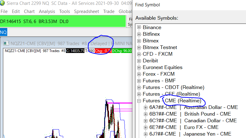 To obtain real-time data you must also pay the exchange fees: Denali Exchange Data Feed: Supported Exchanges (Exchange Fees) And you must also understand the information here: Real-Time Exchange Data Feeds Available From Sierra Chart: Understanding and Accessing Data From the CME, CBOT, NYMEX, COMEX Exchanges (Understanding and Accessing Data From the CME, CBOT, NYMEX, COMEX Exchanges) Since it is not enough just to pay the nonprofessional exchange fees! Sierra Chart Support - Engineering Level Your definitive source for support. Other responses are from users. Try to keep your questions brief and to the point. Be aware of support policy: https://www.sierrachart.com/index.php?l=PostingInformation.php#GeneralInformation For the most reliable, advanced, and zero cost futures order routing, *change* to the Teton service: Sierra Chart Teton Futures Order Routing Date Time Of Last Edit: 2021-09-30 09:08:01