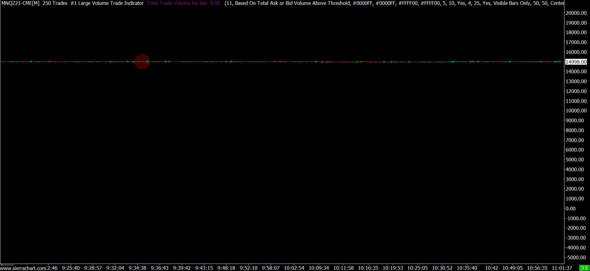 When we opened your chart we see the following: http://www.sierrachart.com/image.php?Image=1633622511766.png So you are getting the Large Volume indicators, but for some reason it is "squishing" the chart down because it thinks there is a zero value somewhere that should be displayed. But, we do not know why this is occurring and when we put the study on ourselves and set everything the same as you had it, everything is working fine. Therefore, please remove the Large Volume Trade Indicator from your chart and put it back on again starting from a "fresh" study (i.e. go to Analysis >> Studies and add the Large Volume Trade Indicator back on the chart). Let us know if you have the same issue again or not. For the most reliable, advanced, and zero cost futures order routing, use the Teton service: Sierra Chart Teton Futures Order Routing |