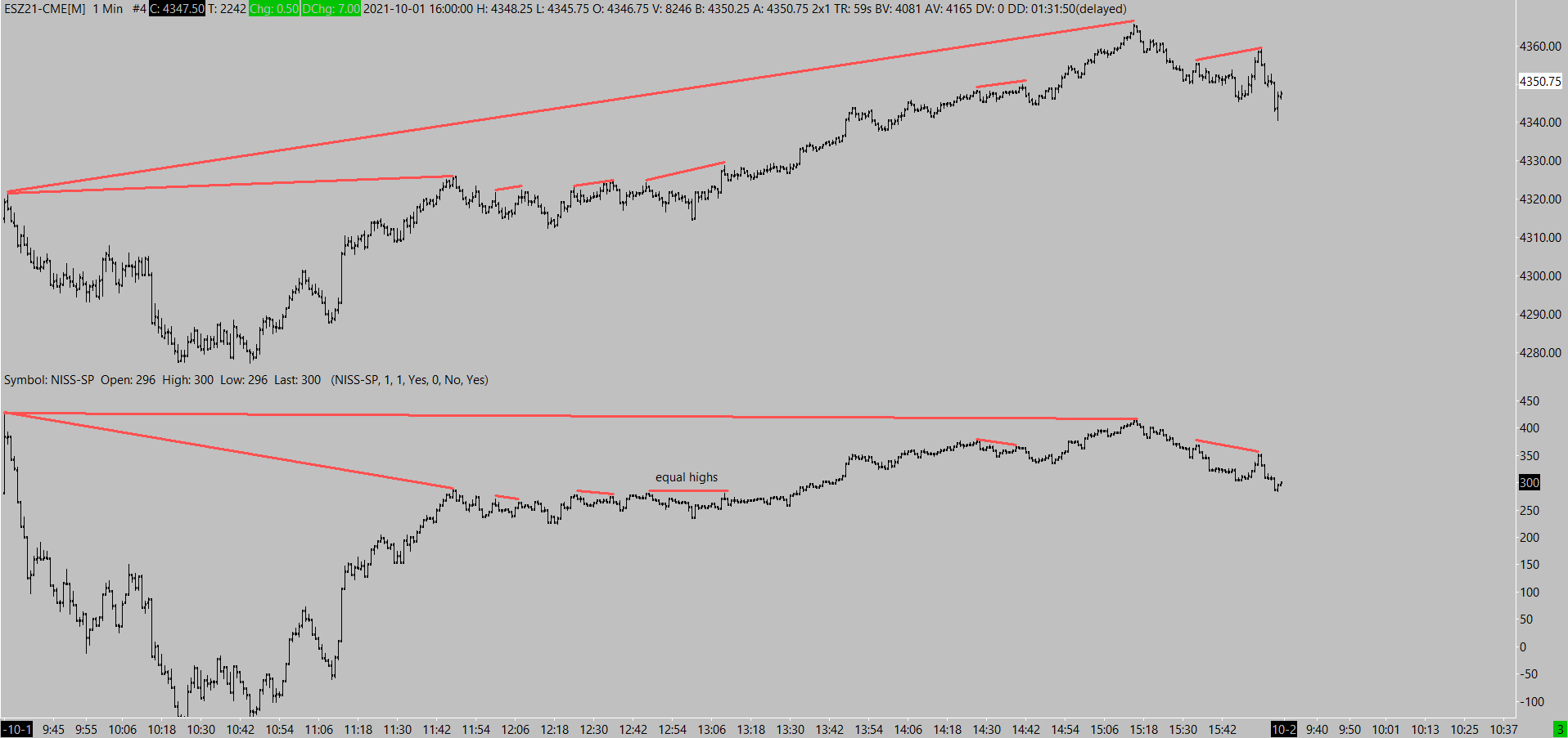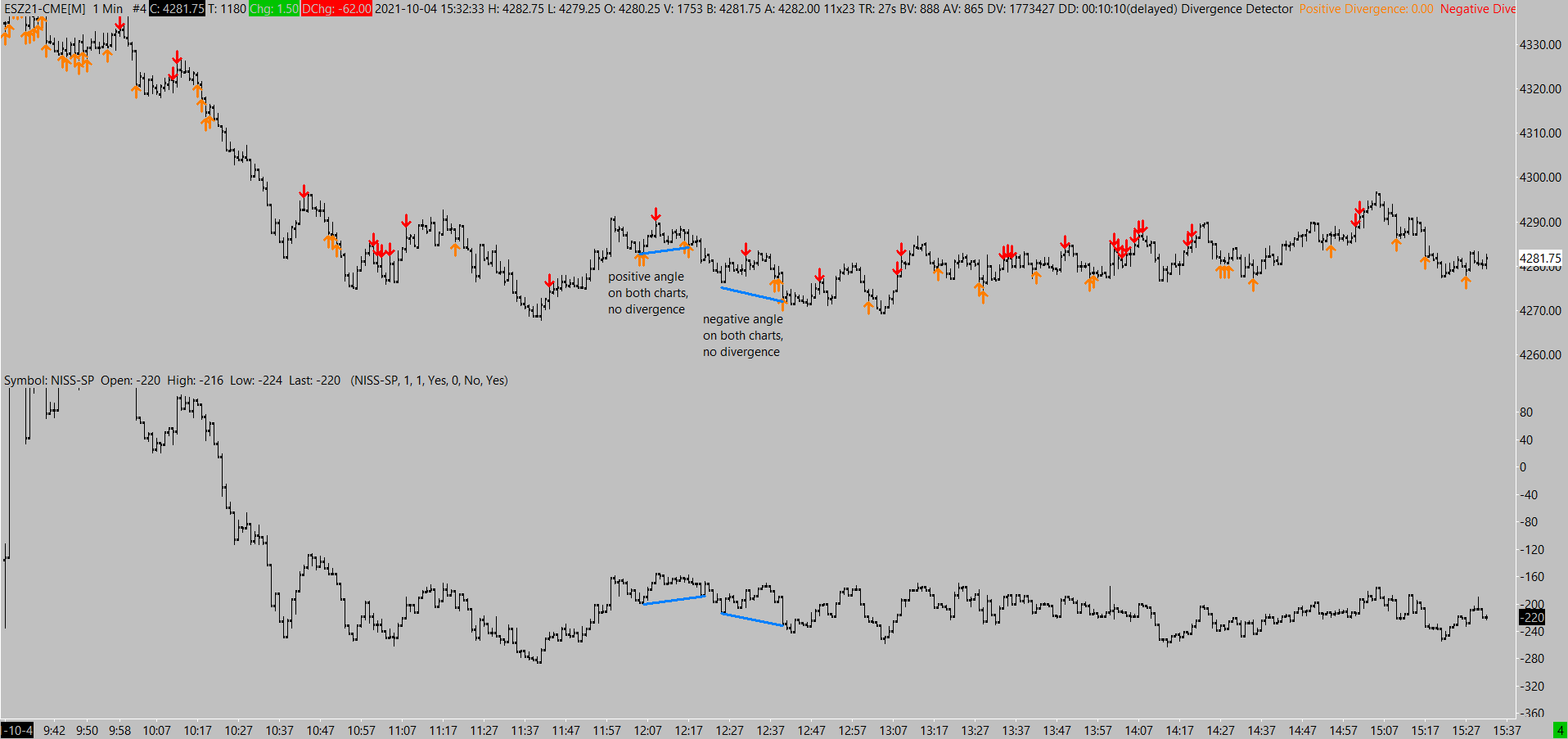Hi All, I am new to Sierra and I am trying to accomplish the following. I have 2 charts, the first is ES and the subgraph is NISS-SP. I need to detect regular divergence between these 2 charts. I have drawn some lines as an example (see image below). Here are some rules: 1. Divergence can be higher highs on the main chart and lower highs on the subgraph 2. Divergence can be higher highs on the main chart and equal highs on the subgraph 3. The number of bars between the higher highs on the main chart and the number of bars between lower highs on the subgraph do not need to be the same. What matters is that there is divergence. 4. Seeing the lines on the chart would be nice, but it is not a requirement. All I need to know is that there is divergence at the moment or not. These rules apply to divergence on the highs. Divergence on the lows would work the same way. I tried to use the Divergence Detector indicator from SIerra and could not make it work. But I think it is not going to work, because there is no fixed length of bars to determine divergence in my case. Also equal highs are allowed in my case. Any help is welcome! http://www.sierrachart.com/image.php?Image=16331831815.png Date Time Of Last Edit: 2021-10-02 14:12:57