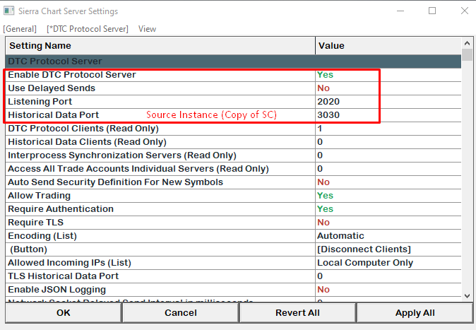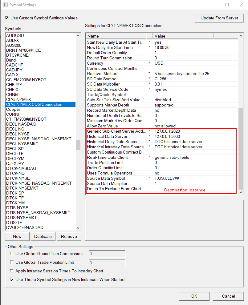 Hello, i try to get my Order Routing from Rithmic (Leeloo) and my market data from CQG, so i have 2 instances with different data service settings and different data files. I used the DTC Protocol Server to get my CQG symbols into my 2nd. instance with Rithmic login. The Real-Time Data works fine, but i got no historical data.. When i disconnect the CQG source instance and then connect it again, i got data lags in the destination instance. It is logic that the destination instance cant load data without the source instance, but why does the historical data do not fill up the data lags? And why i only get 1 Day loaded in the destination instance? Thanks. |
