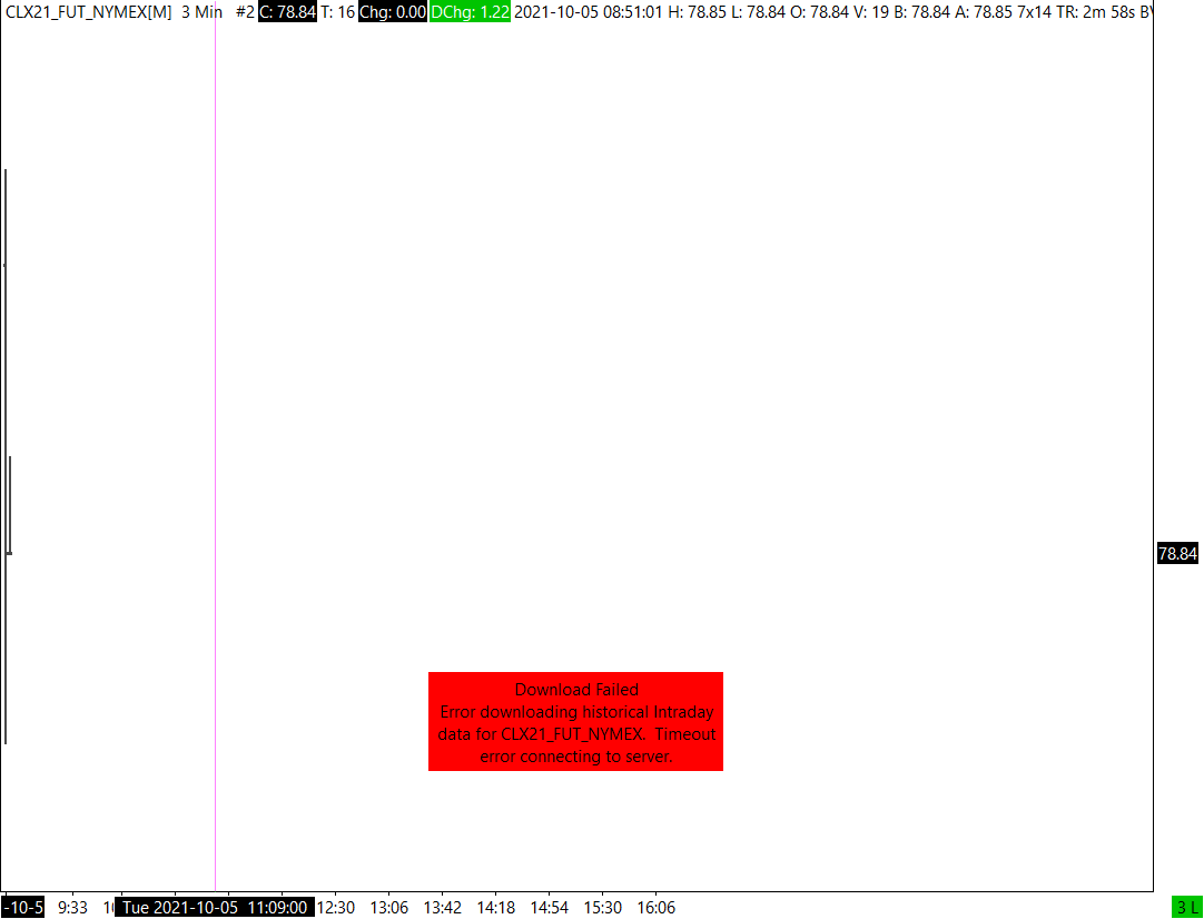 I've checked my internet and is fine. Even I have other instance of Sierrachart with equities data. But I have this error to get chart in CLX21. I tried several times EDIT>>EDIT ALL DATA AND DOWNLOAD. but it isn't working. http://www.sierrachart.com/image.php?Image=1633438263818.png Please help. Thanks |