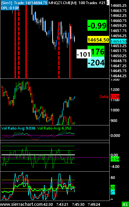 Hello and thank you for the support I can see lines updating on the chart using SS formula study but there are several problems: I entered you formula =IF(AND(ID20.SG1[-1]<=50,ID1.SG1>50),C,ID20.SG1[-1]) un the formula input field. In my case ID20 is RSI TS. I loaded this on a 100 tick bar. Im using Rithmic and Daneli. SC version 2299 64bit (38397M). When the event triggers and RSI crosses up 50, I get a vertical line spanning from the last close of the bar downwards. 1 - Id like the line to capture only the last price at the event timing and stop updating (one event per bar). Right now if the event triggered at price 14700 and bar closes 14710 the line will continue to follow all the way to 14710 instead of remaining fixed at the original price when the event triggered). This is important for my trading concept/system. 2 - No matter which "Draw style" I choose in the subgraph configuration tab, only the first option "line" works. I wanted a horizontal line (just like what you get if you use "tools/horizontal line") and thought "Line at last bar left to right" will do it but neither any other option will. Please advise http://www.sierrachart.com/image.php?Image=1634129084465.png Date Time Of Last Edit: 2021-10-13 12:45:27