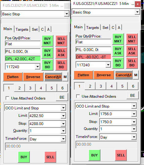 I trade the Micro ES using the ES chart and the Micro Crude using the CL Chart and Micro Gold using the Gold Chart. The profit and loss on the the Micro ES and Micro CL are correct and display the correct sums but the profit an loss on the Gold chart will only show the sum of the full sized contract. Attached are trade window for CL and GC to illustrate this point. How can I get Gold to display the correct price. The settings are exactly the same as near as I can tell. Thanks! |