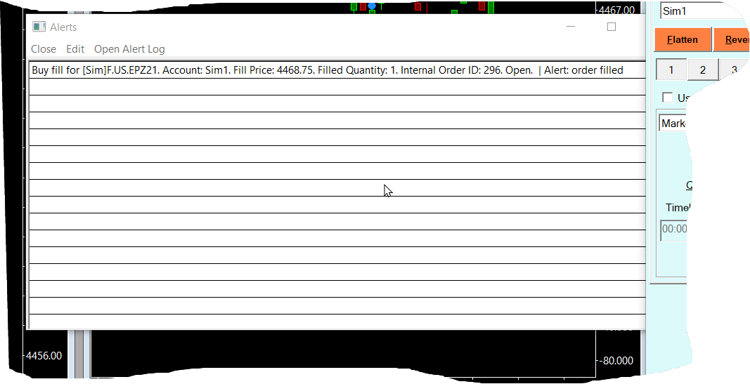 1. You are correct, there is not an alert for "Order Flattened". We have marked this as a Feature Request. 2. Exactly what screen are you getting for the Order Alert? Can you take a screen capture of it and attach that to this thread? For the most reliable, advanced, and zero cost futures order routing, use the Teton service: Sierra Chart Teton Futures Order Routing |