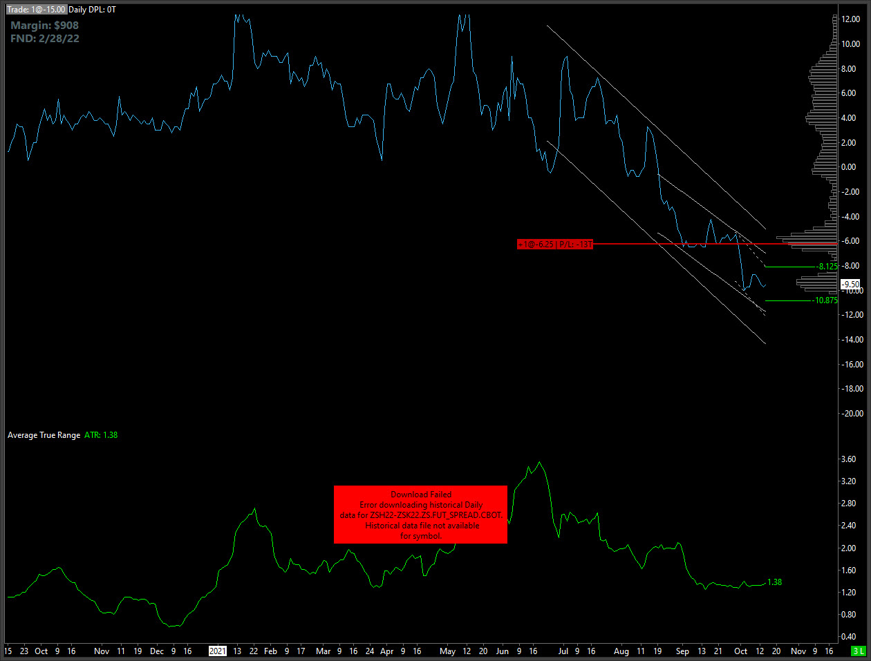 I'm in this trade ZSH22-ZSK22.ZS.FUT_SPREAD.CBOT and have stopped receiving data. No Bid/Ask or historical data. Have tried deleting and downloading data, also disconnecting and reconnecting to the data server. Just checked other spreads I'm watching, and not receiving data on any spread CBOT, NYMEX, CME, or COMEX. Appears to only be the spreads. I'm able to receive data and trade ES, CL, and GC. Date Time Of Last Edit: 2021-10-18 15:00:10