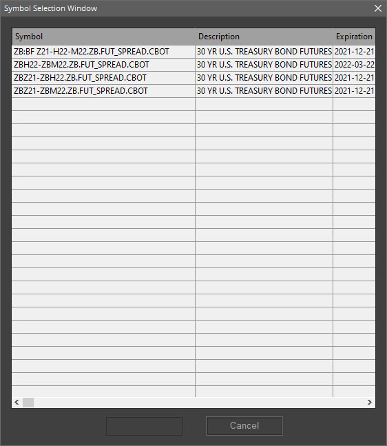 Maybe you're right. I just expected to see a lot more spreads, like in other products (ZC for instance). Here's a few symbols that I would expect to see in the list. They are not too far out to trade. ZBZ21-ZBU22.ZB.FUT_SPREAD.CBOT ZBH22-ZBU22.ZB.FUT_SPREAD.CBOT ZBH22-ZBZ22.ZB.FUT_SPREAD.CBOT Thanks. |