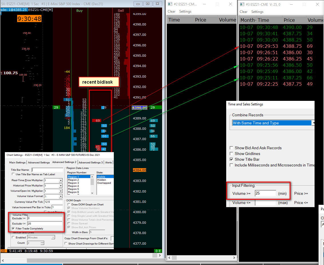 If you set volume filtering in the Chart Setting to exclude a small volume below 25, then when using replay chart, the chart DOM included in the chart is played intermittently, displaying only the volume that appeared on the recent graph above 25. The result is a filtered recent bid / ask volume DOM. It is excellent! But in the case when trading takes place in real time, neither ChartDOM nor TradeDOM is filtered. This is not very logical, since it is not identical in real trading and backtesting. How can I enable filtering in DOM for recent bid / ask volume to be filtered, how is this fine in backtesting? |