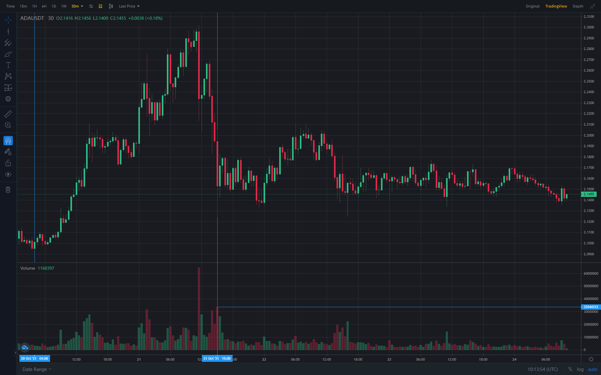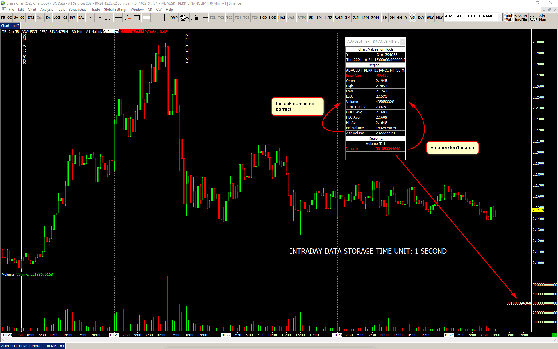 rel 2320 ADAUSDT_PERP_BINANCE (but the problem is for all the crypto that I checked) All charts are timeframe 30', time zone UTC, 00.00-23.59 session times There are big differnces in volume downloading data with 1 second e 1 minute intraday data storage time unit, images come from two separate SC install. The 1 second is similar to the chart from Binance and Volume values are similar. Anyway the volume from the Volume study is very different from the volume field in the "tool value window", and bid ask sum differs from total volume. I know that Binace feed is poor but and you hate them but really I don't understand this big difference in volume for 1 minute and 1 second storage time unit. I prefer to have 1 minute resolution data to speed up loading e calculation but volume is bad. Is this something that you can fix? TY Date Time Of Last Edit: 2021-10-24 10:58:48