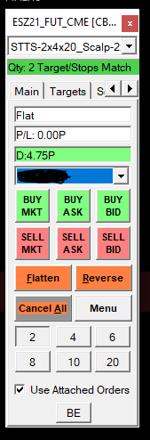 Is there a way to do the following with the Trade Window Buy/Sell buttons... When I hit one of the BUY buttons (your choice of which one, such as BUY BID), I'd like to place a buy limit order at current price - 2 ticks. When I hit one of the SELL buttons (again, your choice of one, such as SELL ASK), I'd like to place a sell limit order at current price + 2 ticks. I still want the order to [Use Attached Orders], and all the T1, T2, STOP, etc. parameters associated with this. The only difference from what I'm doing now is that I'd like a preset offset to automatically be added to or subtracted from market price. I can't do this by left-clicking the mouse on prices and making mouse selections, because this process is too slow for what I need to do... I need to be able to have my mouse hovering over a button, and as soon as I click it (buy or sell), the above actions to take place. I don't care if it's a custom button, as long as I can do this. Please advise... thank you. |