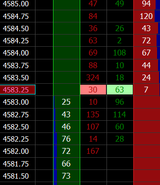 Hello, I want to receive a notification if the number of contracts pending in limit orders (say in the range of 10 ticks from the current price) exceeds a specific value at some price level. For example, I want to be notified if the number of contracts exceeds 100, within 10 ticks of the current price. If there was a situation like in the picture, I would get a notification because at the price of 4584.75 (which is 6 ticks from the current price, so less then 10 ticks) there are 120 contracts (so more then 100). I hope I have made it clear what I mean. Thank you in advance for your help. |