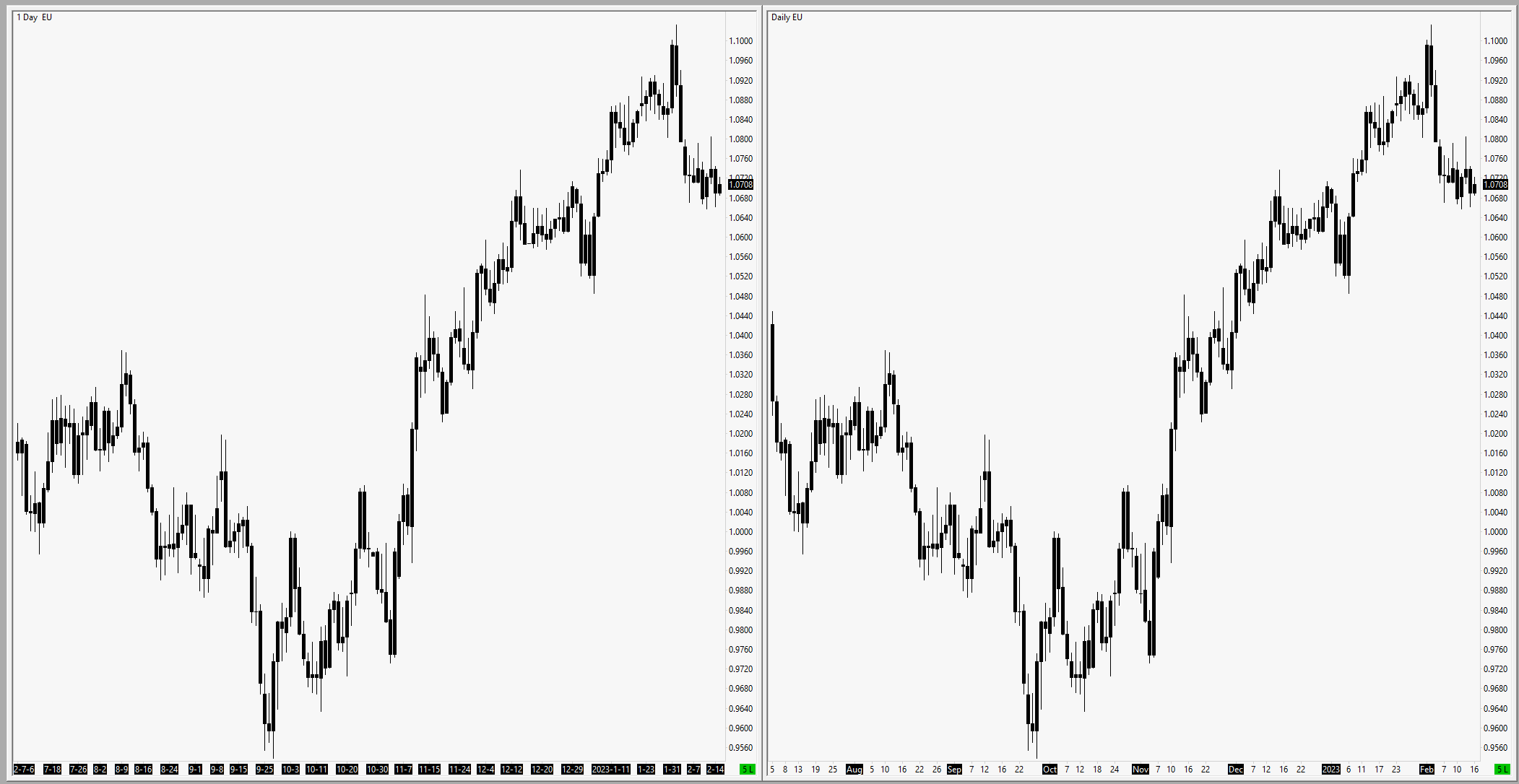 Thanks John, I expounded as the above must not be clear enough. All data is spot-FX, so should not be a need for continous futures. Intraday 1D vs Historical Daily is fine (fig 1) Intraday 7D vs Historical Weekly is wrong (fig 2) Intraday 5D is wrong also. This doesn't pose a problem until one needs to invert a historical chart. Because historical charts do not invert due to the larger issue raised in this thread, of it not being constructed by tick data. Date Time Of Last Edit: 2023-02-16 10:49:55
