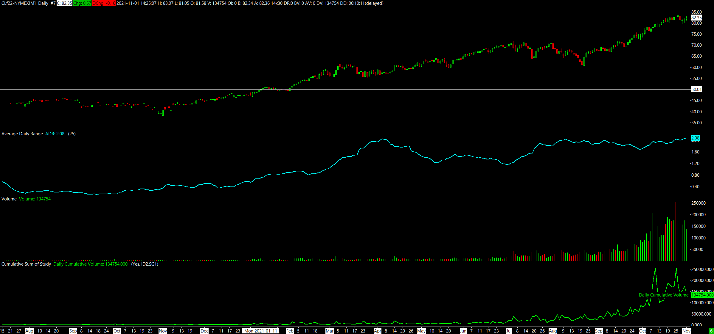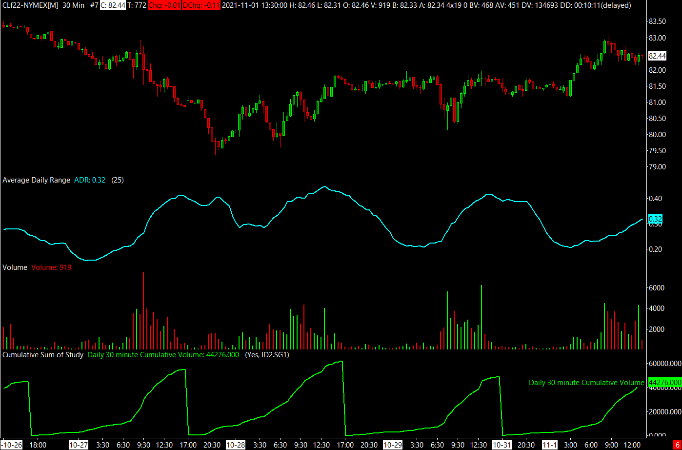 When getting Volume figures from Volume Study in the Jan 22 Nymex Crude Contract. When adding up a days worth of 30 minute volumes does not equal a daily volume bar. Daily volume bar was 135,000 Volume where 30 minute volume bars added were showing 44,500 for the day. http://www.sierrachart.com/image.php?Image=163579515154.png http://www.sierrachart.com/image.php?Image=1635795326235.png |