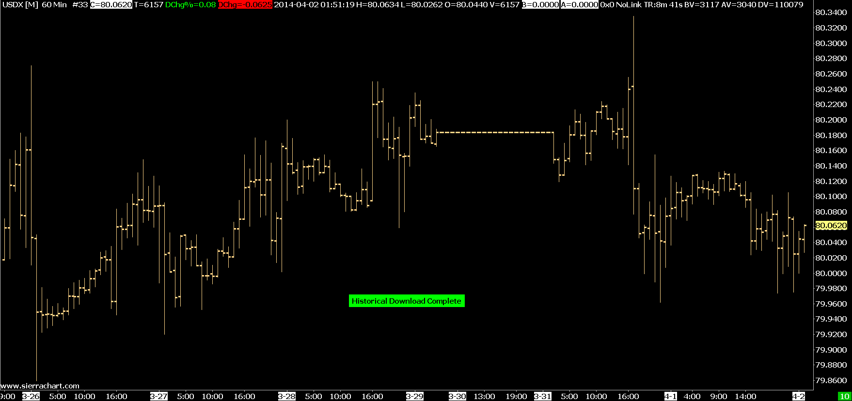 Looking at the candles and referencing the TPO example above the session time is 16.00.00 - 03.59.59 and I have no data from 3-28 03.59, data kicks back in 3-31 02.20. This makes sense since you are filtering out that data with these Session Times.If there is missing data in the chart, then follow the instructions in help topic 7.1 here: https://www.sierrachart.com/index.php?l=doc/helpdetails7.html This is the data that we see using a +8 UTC time zone: http://www.sierrachart.com/image.php?l=1396374681124.png Sierra Chart Support - Engineering Level Your definitive source for support. Other responses are from users. Try to keep your questions brief and to the point. Be aware of support policy: https://www.sierrachart.com/index.php?l=PostingInformation.php#GeneralInformation For the most reliable, advanced, and zero cost futures order routing, *change* to the Teton service: Sierra Chart Teton Futures Order Routing |