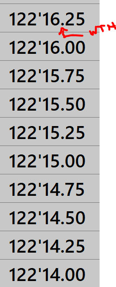 Is it possible to show the price in the attached as just 122'1550 or 122'1525, instead of 122'15.50 or 122'15.25 ? The decimal is really annoying. It would also be great to resize the price column one day to hide the 122' part... Date Time Of Last Edit: 2021-11-06 04:29:00